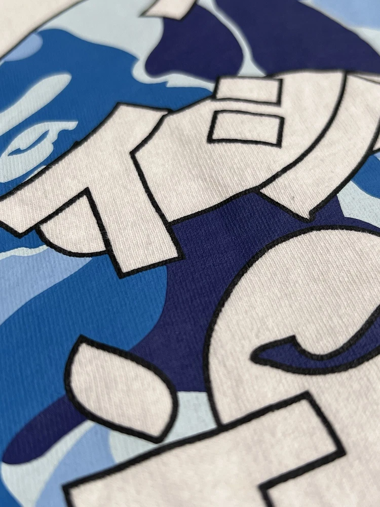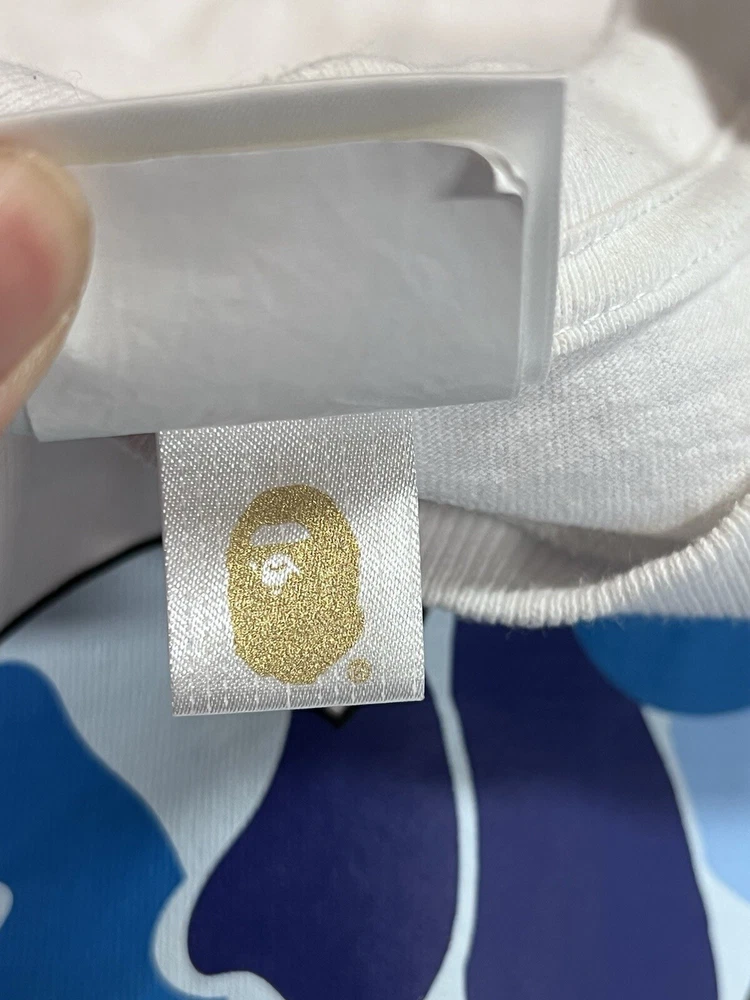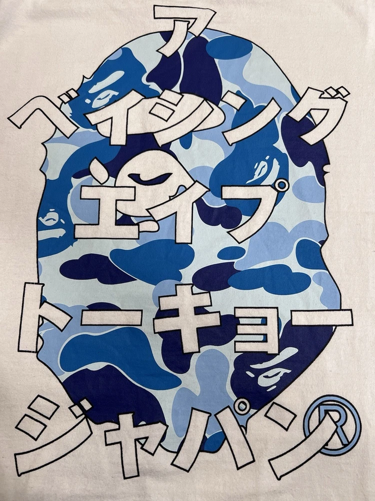 Bape Blue Camo Ape Head White Tee Length 26” Width 18” Good Condition White Bape Blue Camo Tee Dope Japanese Text Logo Over Ape ITEMS ARE ALL COMPETING FOR PURCHASE IN STORE EVERYTHING GOES FAST! #bape #bapetee #bapecamo #blue This BAPE Blue Camo Ape Head White Tee is a stylish addition to any designer's wardrobe. The shirt features a unique camouflage pattern, short sleeves, and a crew neck. It is made of high-quality cotton material, ensuring comfort and durability. The tee comes in a regular fit and is available in size S. The shirt is perfect for all seasons, with its colorful design and regular size type. It is a must-have for any men's clothing collection, and its brand value is unmatched. Add this White Tee to your wardrobe today and elevate your style game!