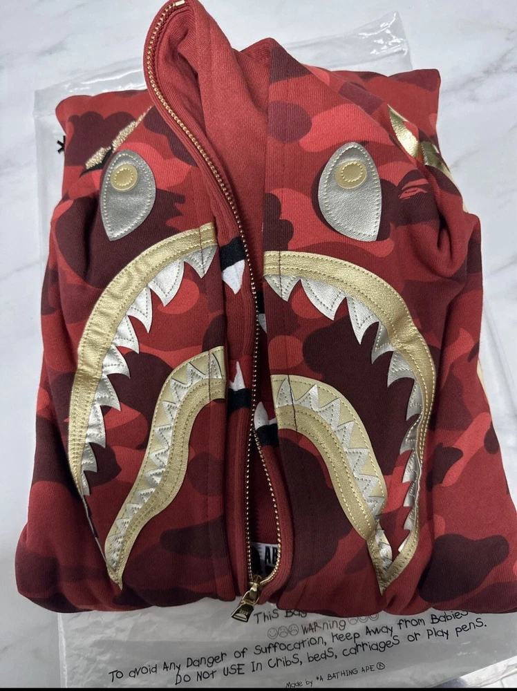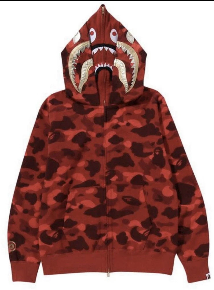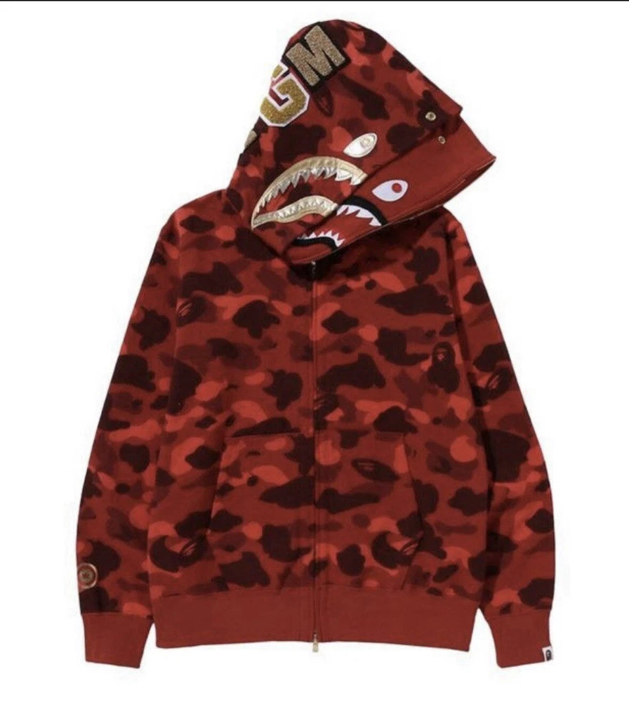 This BAPE Color Camo Double Shark Full Zip Hoodie in 'Red' is a designer streetwear piece for men. Made with high-quality cotton fleece material, it features a full zip closure, hooded design, and pockets for convenience. The hoodie is accented with a zipper, embroidered logo, and is a part of the Bape product line. It is available in XL size and has a regular fit. The hoodie is perfect for those who love colorful and unique designer pieces. It is made in Japan and is a great addition to any streetwear collection.