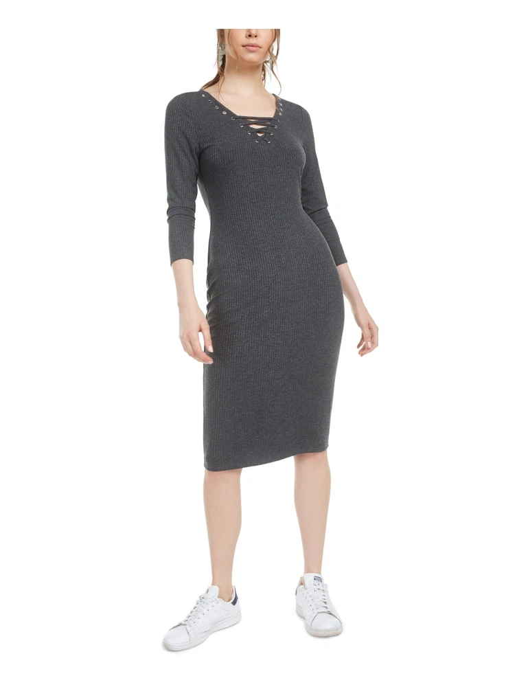 BAR III Womens Gray 3/4 Sleeve Tie Neck Below The Knee Body Con Dress Size: XXS