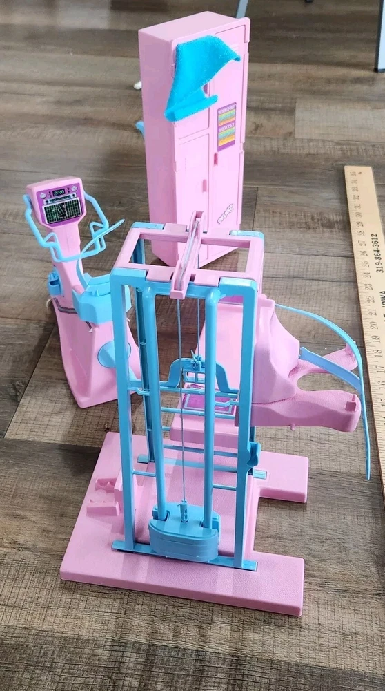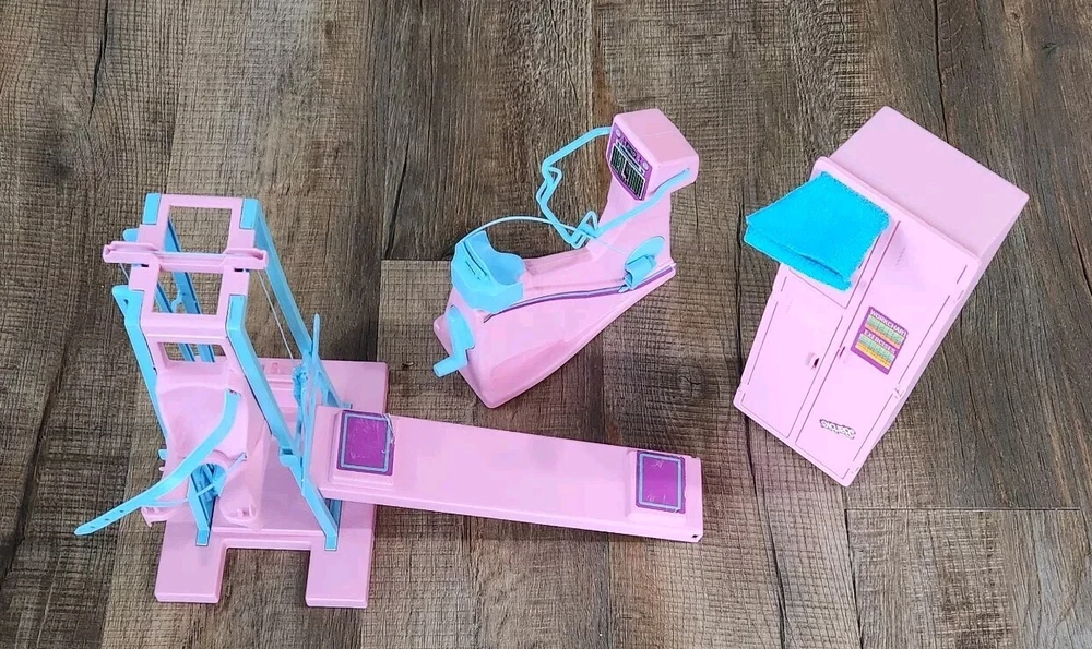 This vintage Barbie workout gym equipment is a must-have for any Barbie collector. Made in 1984, this pink plastic furniture is in its original state and is perfect for displaying in the garage or any room in the dollhouse. The equipment features a variety of features that are true to the era and will add a touch of nostalgia to your collection. It is an original piece and is not personalized. The Barbie brand is known for its quality and this furniture is no exception. The time period manufactured is from 1980-1989, making it a rare find. Handmade pieces are not included.