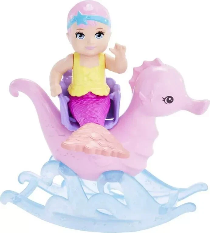 Help Barbie doll care for a merbaby, baby seal and baby octopus in this fantasy set that puts a magical twist on classic nurturing play The mermaid has lavender fantasy hair and a beautifully sculpted pastel pink tail with purple fins. She wears a bright yellow bodice and a ruffled overlay at her hips! The nautical, Ferris wheel-inspired bed has three shell cribs and really spins! Tuck each of the little ones inside with a pearl belt to make sure they stay safe and sound Seat the merbaby on the adorable seahorse rocker for a fun activity! Its gentle swaying mimics the motion of ocean currents, which is super soothing for a newborn mermaid The included bottle and blanket help encourage nurturing role-play. From swaddling the seal to playing hide and seek with the octopus or feeding the merbaby, there are so many story possibilities! 3+ years Brand new in sealed box; box has slight shelf wear From a smoke-free home Returns accepted if I missed a flaw or made a mistake and I will pay the return shipping. Otherwise return shipping is at buyer's expense. I am happy to combine and reduce shipping on all items if possible. I ship within 2 business days.