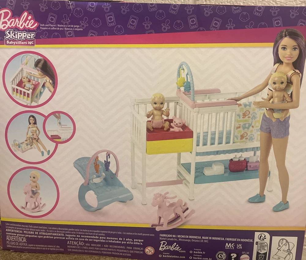 Doll Gender: Girl Doll UPC: Does not apply Antique: No Year Manufactured: 2019 Doll Size: 12 in Vintage: No Material: Plastic Doll Eye Color: Blue Original/Licensed Reproduction: Original gtin13: Does not apply Brand: Mattel Doll Hair Type: Straight Product Line: Barbie Skipper Babysitters Set Includes: Doll, Crib, Changing Table, Blanket, Animal Figure Doll Hair Color: Purple Doll Complexion: Medium Type: Doll Playset Character: Barbie