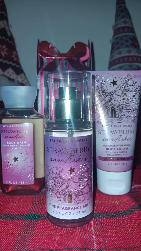 BATH & BODY WORKS "STRAWBERRY SNOWFLAKES!" 6 PIECE ONE OF A KIND GIFT SET INCLUDES LIP MASK, LIP BALM, LIP TINT, & TRAVEL SIZE SHOWER GEL, LOTION, AND BODY SPRAY