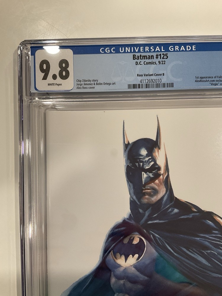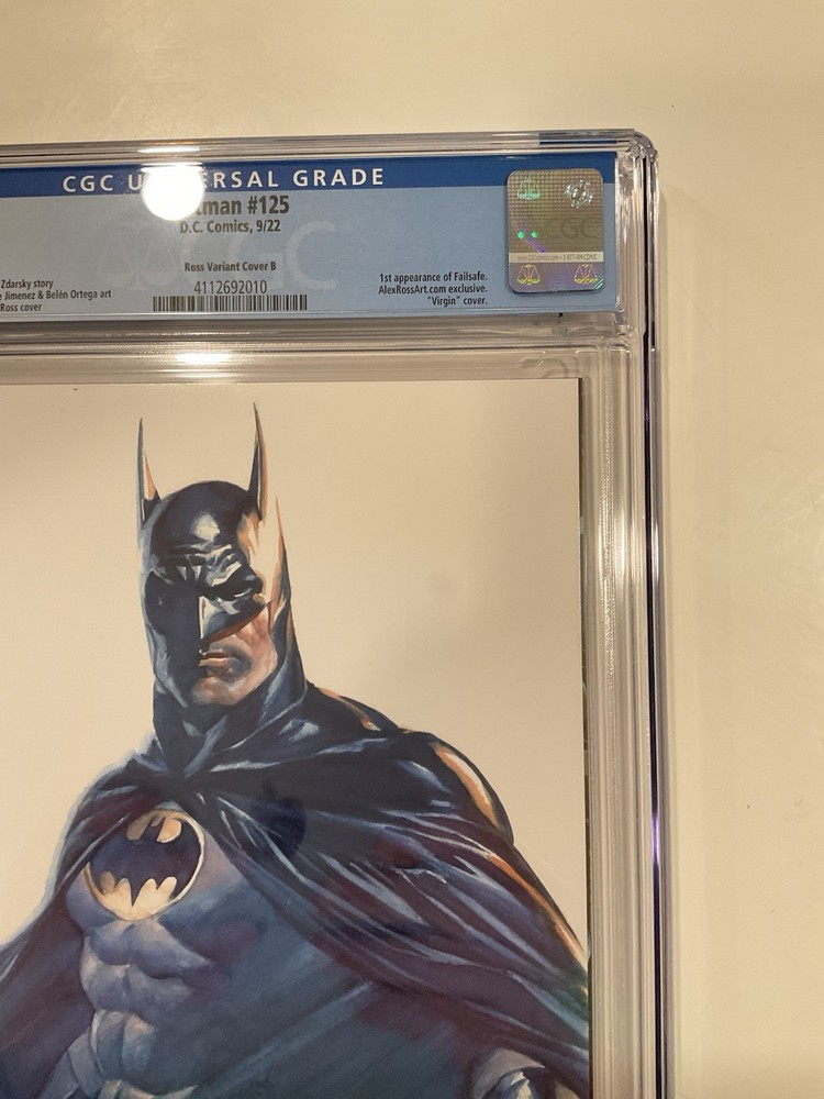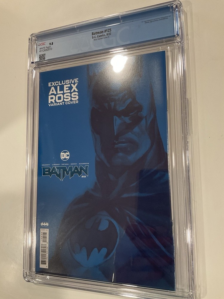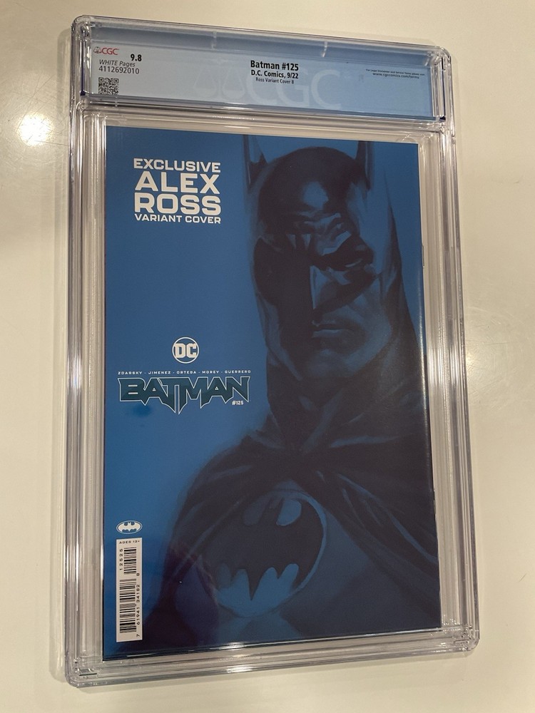 The product is a Batman comic book issue #125 featuring a CGC 9.8 Mint grading and a variant cover by artist/writer Alex Ross. This specific variant is a virgin variant, meaning it does not have any text or logos on the cover, adding to its rarity and appeal to collectors. The comic is part of the US Comics tradition and belongs to the Batman series, making it a highly sought-after addition for comic book enthusiasts.