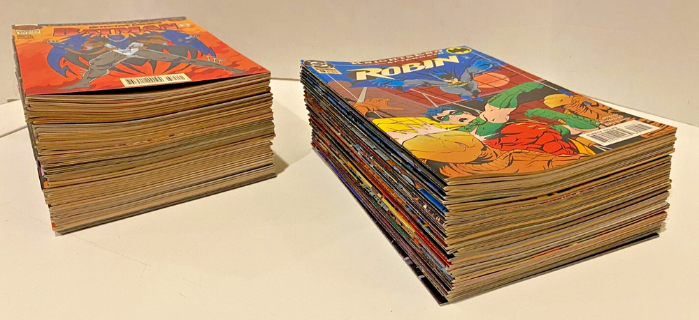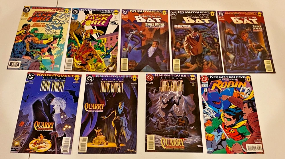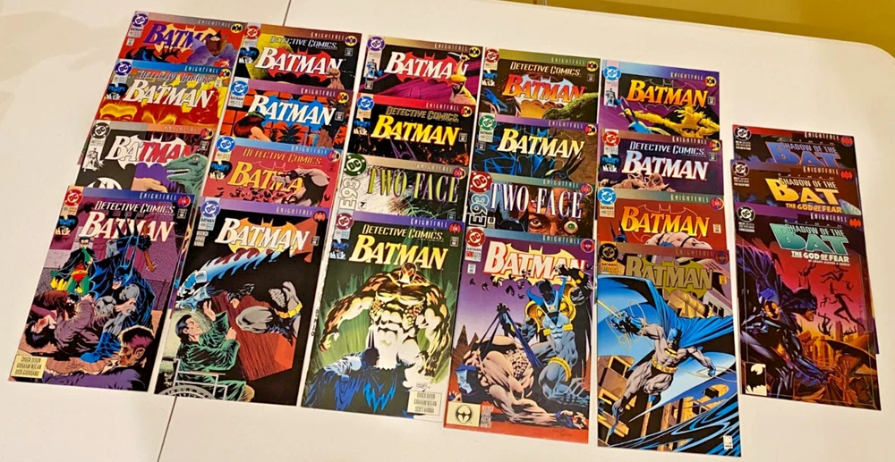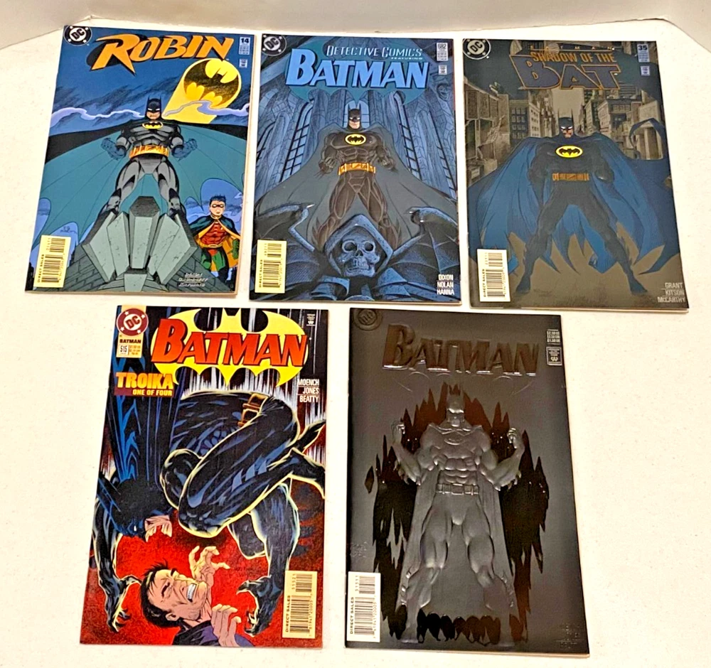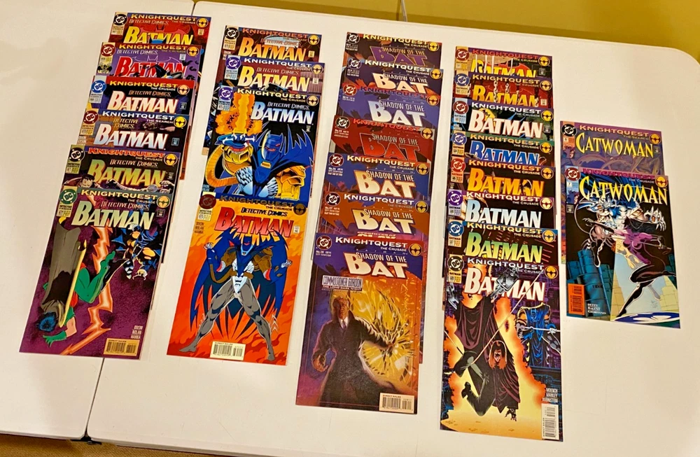 BATMAN "Cross-Over" SERIES 90 BOOK COLLECTION DC COMICS 1993/1995 This set of books was compiled and sold in my old shop back in the day when it was SUPER HOT!!! This set/lot of books has been set aside and stored in boards & bags for 30 years. For this sale I have REPLACED each book with a NEW board & Bag!! They should all be in VF/NM condition, but unless you are with the CGC as a grader, then this is a subjective matter. YOU BE THE JUDGE, see the scans I also added the OVERSTREET grading guides for you to read. From what I saw, almost all books were NM, smooth spines, no stress lines, clean staples, sharp corners almost no edge wear. Out of 90 books there might be a couple with some imperfection somewhere. Just to be safe, let's say they are "just not perfect" THIS SALE INCLUDES: KNIGHTFALL Apr 93 - Oct 93 Prelude BATMAN 491 "Signed w/COA BATMAN 492-500 497 has the flip cover 500 has 2 books, the regular & Glossy Die-Cut Cover copies DETECTIVE COMICS 659-666 SHADOW OF THE BAT 16-18 SHOWCASE93 7-8 KNIGHTQUEST Oct 93 - June 94 THE CRUSADE BATMAN 501-508 DETECTIVE COMICS 667-675 675 has 2 books, the Embossed & Variant covers SHADOW OF THE BAT 19-20, 24-28 CATWOMAN 6-7 THE SEARCH JUSTICE LEAGUE TASK FORCE 5-6 SHADOW OF THE BAT 21-23 LEGENDS OF THE DARK KNIGHT 59-61 ROBIN 7 KNIGHTSEND July 94 - Feb 95 PART 1 THRU 10 BATMAN 509-510 DETECTIVE COMICE 676-677 SHADOW OF THE BAT 29-30 LEGENDS OF THE DARK KNIGHT 62-63 CATWOMAN 12 ROBIN 8 AFTERMATH CATWOMAN 13 ROBIN 9 SHOWCASE94 10 PRODIGAL Nov 94 - Jan 95 PARTS 1 THRU 12 BATMAN 512-514 DETECTIVE COMICS 679-681 SHADOW OF THE BAT 32-34 ROBIN 11-13 TROIKA Feb 95 BATMAN 515 2 books, Black Embossed Cover & Variant SHADOW OF THE BAT 35 Embossed Cover DETECTIVE COMICS 682 Embossed Cover ROBIN 14 Embossed Cover See my store for other comic specials. I also have about 30,000 comics in stock that I just do not have the time to list. They are from the 1970's thru 1990's from the old shop I had back then. COMICMAGE / CCC COLLECTIBLES has been around for 40+ years. Please feel free to ask questions. ..From a smoke free environment. Sadly comic books can not be shipped media rate. These will ship wrapped and padded in a solid box (maybe 2) with insurance & tracking.