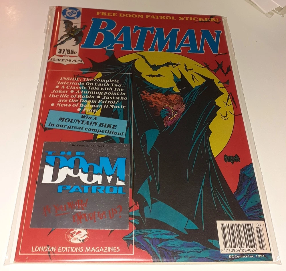 A new selection of rare comics fanzines from my large collection built up over the years.... BATMAN MONTHLY no.37 aka BATMAN no.423 UK EDITION London Editions (UK) / DC Comics (USA), Jul 1991 Featuring the classic Todd McFarlane cover High grade original vintage copy complete WITH THE VERY RARE SILVER "DOOM PATROL" STICKER FREE GIFT still attached to the cover! 90% of copies do not have this ! Condition - lovely solid high grade copy, grades NM range, NO WRITING, (please see pics), bagged & boarded I'm a well-established collector on the Facebook Foreign Forum. Happy to discuss offers. Please see my other rare comics & fanzines! Multiple purchases welcome and postage will be combined Any questions please ask, I am not a business - I am a collector too! best regards Ewan