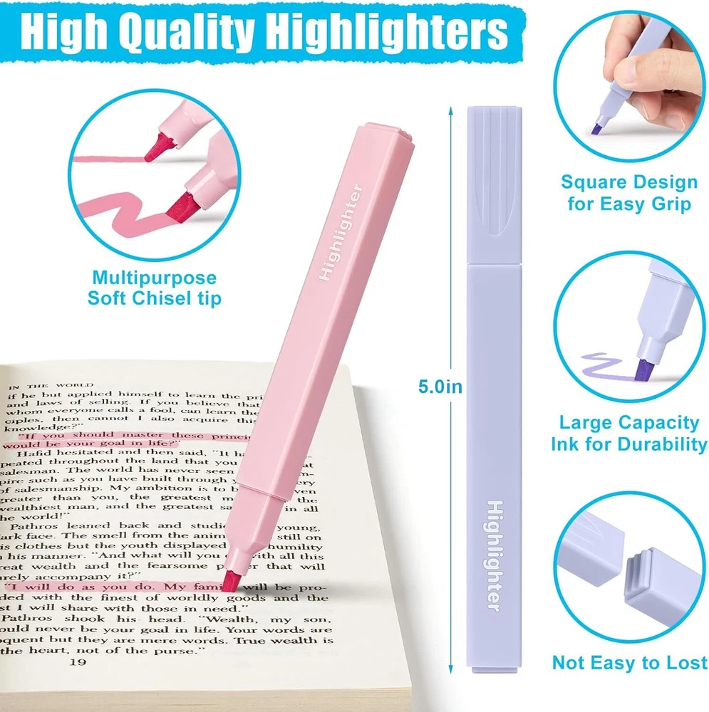 BAYSING 10 Pcs Highlighters Set in Assorted 1 Count (Pack of 10), Multicolor Product Details Manufacturer: BAYSING Brand: BAYSING Item Weight: 3.2 ounces Product Dimensions: 5 x 4 x 0.55 inches Item model number: BA-PEN001 Color: Multicolor Number of Items: 10 Size: 1 Count (Pack of 10) Point Type: Fine Ink Color: Multicolor Manufacturer Part Number: BA-PEN001 Brand: BAYSING Ink Color: Multicolor Number of Items: 10 Point Type: Fine Recommended Uses For Product: Writing Value Highlighters Set - Highlighter set includes 28 bright highlighters in 6 colors. There are 6 each of yellow and pink, and 4 each of blue, green, orange, and purple. With 6 colors of highlighters to choose from, you can easily color code notes and study materials to make your notes look clear and organized. Non-Bleed & Quick-Drying Highlighter - Highlighter pens use quick-drying ink, making highlighted marks clearly visible without worrying about the ink staining your hands and your book. Even if you highlight one side of the page, the other side is still completely readable, and there's no need to worry about ink bleeding through and affecting the readability of the page. Multifunctional chisel tip - The highlighter set comes with multifunctional soft chisel tip. By switching the different angles of the tip, you can easily draw thin or wide lines for highlighting, meeting different note-taking needs. And with the highlighter's soft chisel tip, they glide smoothly across paper, leaving vivid and precise marks. High quality bright highlighter - Highlighter refills are made of high-quality materials, safe, non-toxic, and odorless. Each refill contains rich, deeply saturated pigments that create bright colors that won't fade over time. The bright colors are perfect for emphasizing important text in notes, textbooks, and other materials, making your text easy to read Multi Purpose - Whether you're annotating documents, highlighting textbooks, doing extensive research and reading, or creating colorful works of art, these highlighters are versatile tools. Highlighter set is ideal for use in schools, homes, offices, etc. It is also an excellent choice for school supplies or office supplies. Non Bleed highlighters are great as gifts for family, friends and kids around you.