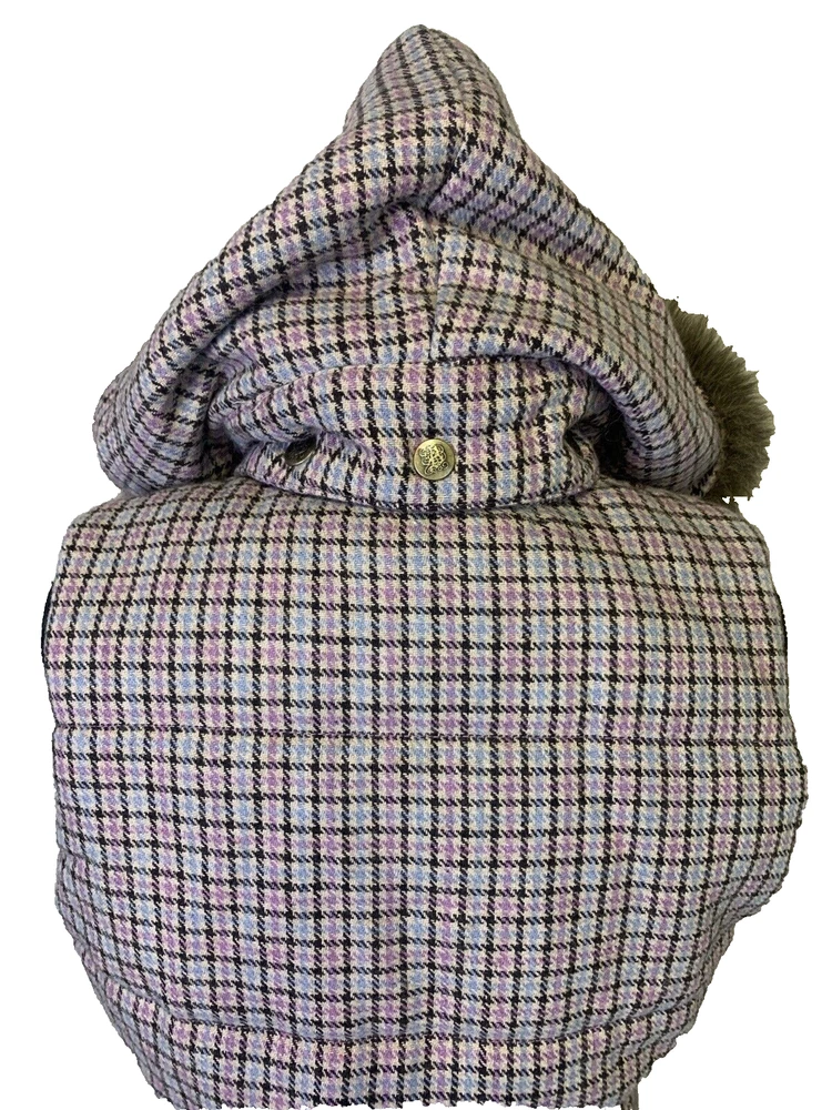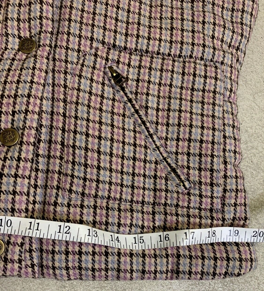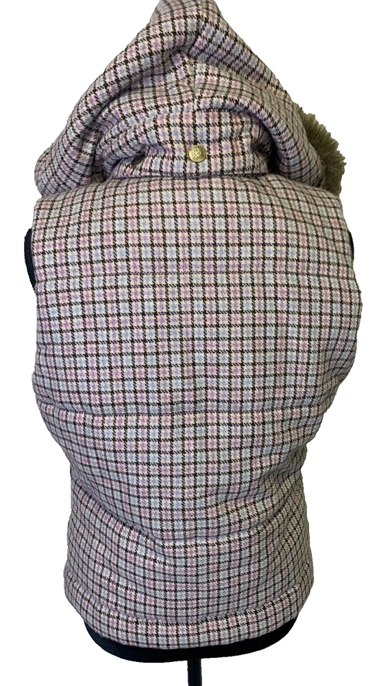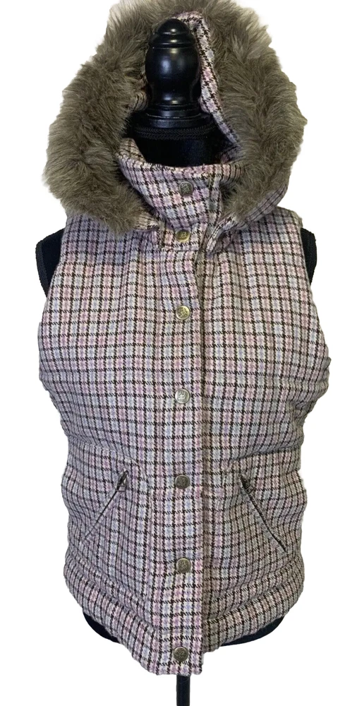 BB Dakota Vest Womens Large Pink Plaid Wool Blend Hood Faux Fur Trim Snap Front Excellent pre-owned condition. No visible flaws. -50% Polyester/30% Acrylic/10% Wool/6% Rayon/4% Nylon/ -Fully Lined -Zipping Pockets -Hand Wash Cold -SKU E24-792 -Measurements laying flat: Chest: 21" Waist: 20" Length: 23" Questions? Please ask. Ships next business day. Offers welcome.