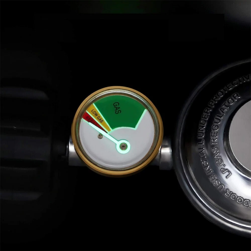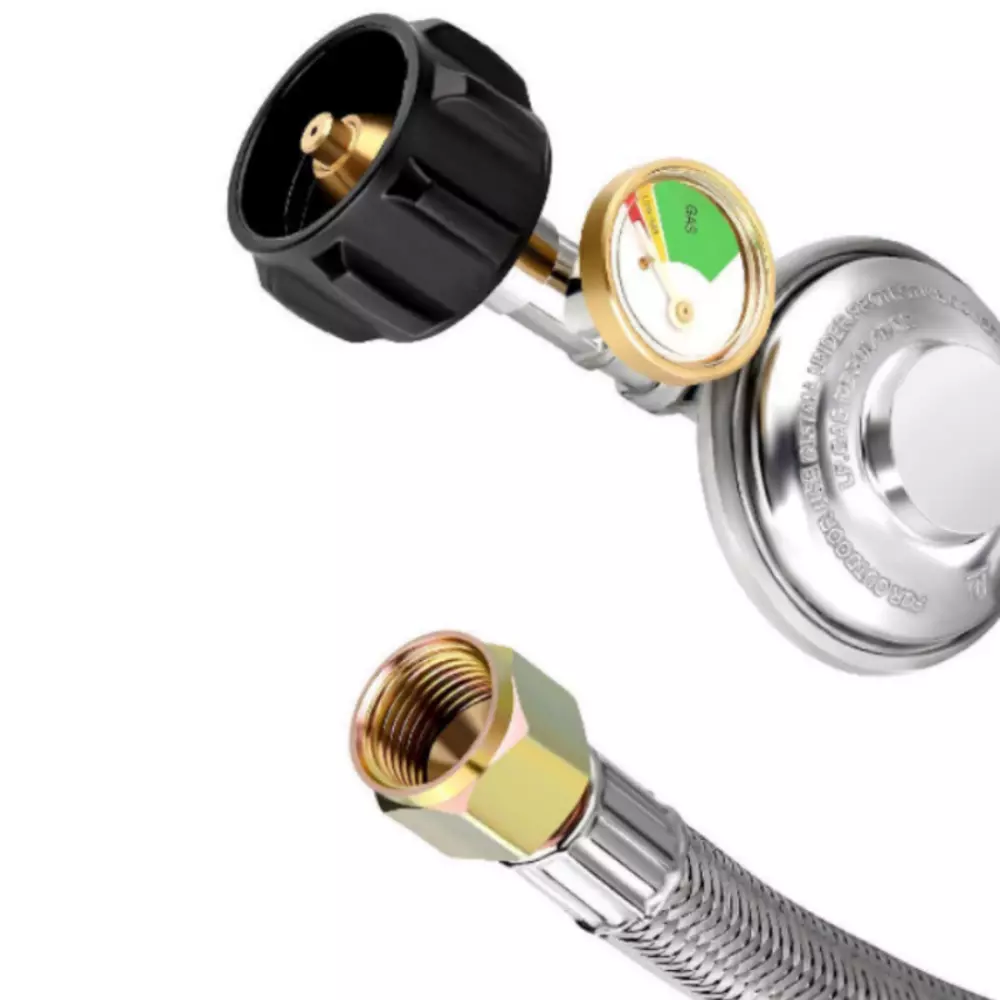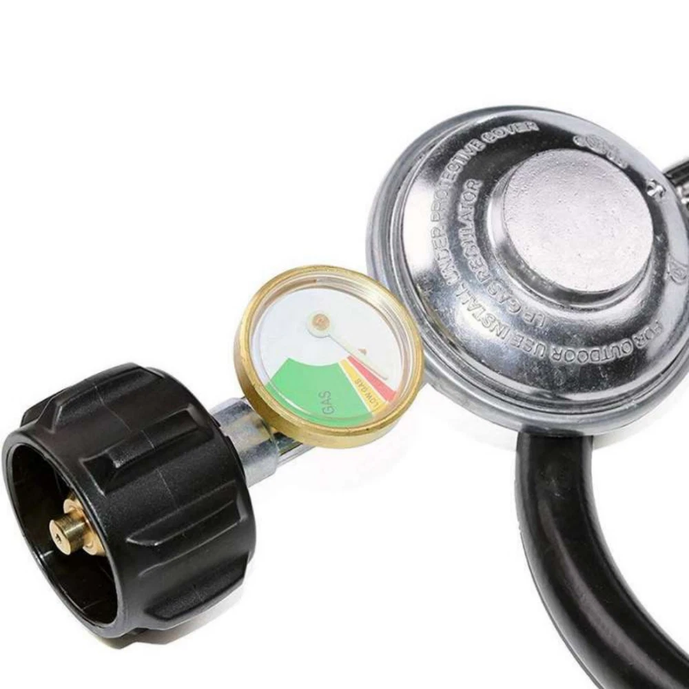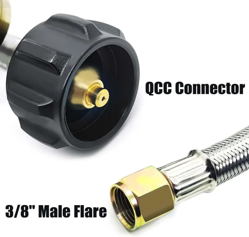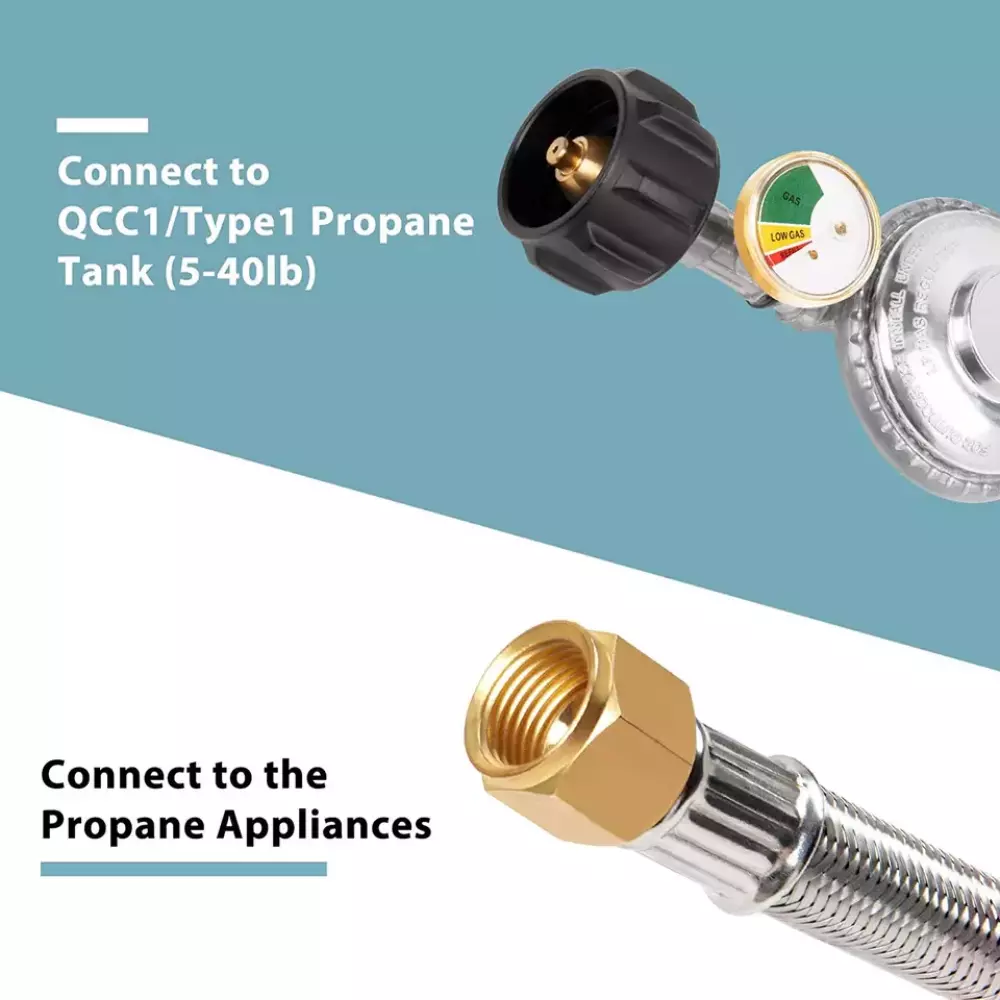 BBQ Grill Low Pressure Propane Regu lator Hose 5 FT with Gauge for Gas Pit, Stove Product Description Item Detail: Durable Stainless Braided Propane Regulator Hose. Equipped with propane tank gauge. QCC-1 tank connect - fits all appliances with a Type 1 connection . 3/8" female flare swivel nut which has an outside diameter of 5/8" in order to accommodate for the flare seat Replacement for Weber Genesis 300-series gas grills, Genesis Silver C, Genesis Gold , Genesis Platinum , Spirit E-210/E-310 etc. and most of Char-broil gas grill with side burner, Dyna-Glo dgp350snp-d, mfa350bnp/mfa350cnp ge530bsp-d, dge486ssp-d, dge486gsp-d etc. , Uniflame GBC873W-C, GBC873W, GBC940WIR, GBC940WIR-C, GBC976W, GBC956W1-C, GBC1076WE-C, BH12-101-001-02 etc. , most of Kenmore gas grill and most of Brinkmann gas grill. Easy installation - No tools required, tool-less attachment to tank. It is normal if you hear noise in the regulator, it is the resonance of the gas in the regulator. Fits most gas grill, heater, fire pit, lp generator, lantern, two burner camping stove, side burner, and used for most low pressure gas propane application Product Specification: Hose Length: 5feet/ 60inch Regulator Type: Low Pressure Inlet Diameter: QCC or POL Outlet Diameter: 3/8'' Female Flare Fitting(5/8-18UNF) Inlet Pressure: 25-250 PSI Outlet Pressure: 11’’W.C. Flow Capacity: 80000 BTU/Hr Attention: Please check to see if the propane tank has the standard propane valve fitting QCC1/Type1 and check your appliance connection if is 3/8’’ Male Flare Fitting Connector. Warning !!! For your safety ALL propane appliances like gas grills, heaters and stoves are OUTDOOR USE. Checking this hose both end must be fully tightened and keeping the hose away from HIGH TEMPERATURE. To check and make sure the hose is away from the OPEN FIRE before installing to your appliances.