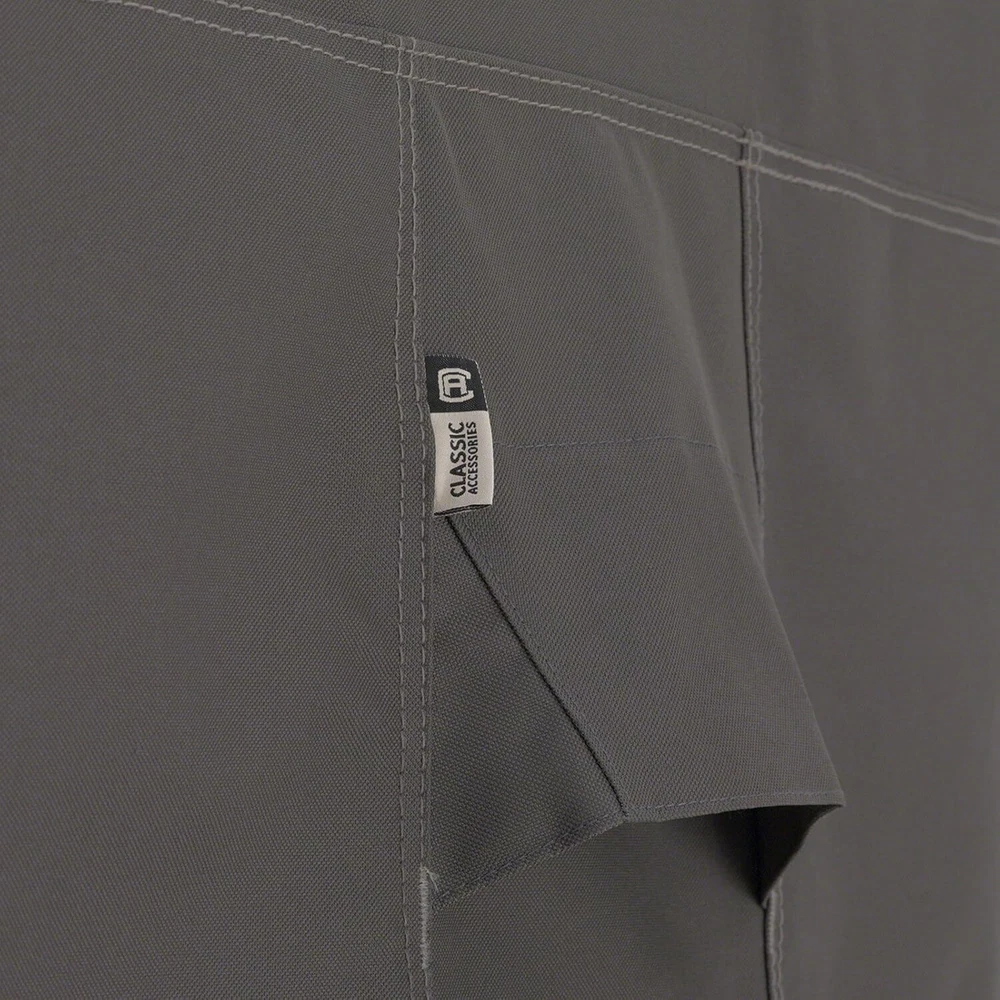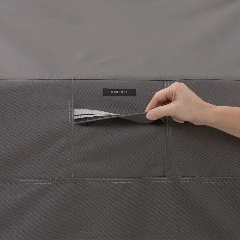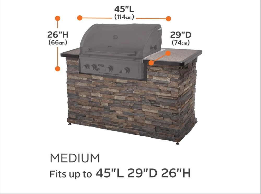 BBQ Grill Cover for Built-in Barbecue Grill Tops, Taupe Perfect Fit for Grill Tops : Designed for built-in barbecue grill tops measuring 57"L x 29"D x 26"H, ensuring a snug and secure fit. Durable Gardelle One Fabric : Made from woven polyester with a UV-stabilized coating and water-resistant laminated backing to keep your grill dry and protected from the elements. Secure and Easy Fit : Features elastic hem cords that move smoothly through a special channel, along with custom-colored buckles for a tailored fit. Convenient Design : Reinforced padded handles make removal effortless, while air vents provide maximum ventilation and reduce condensation buildup. Ravenna Collection : Combines durable construction, stylish design, and practical features, offering reliable protection for years to come. Thank you for viewing our BBQ Grill Cover for Built-in Barbecue Grill Tops, Taupe.