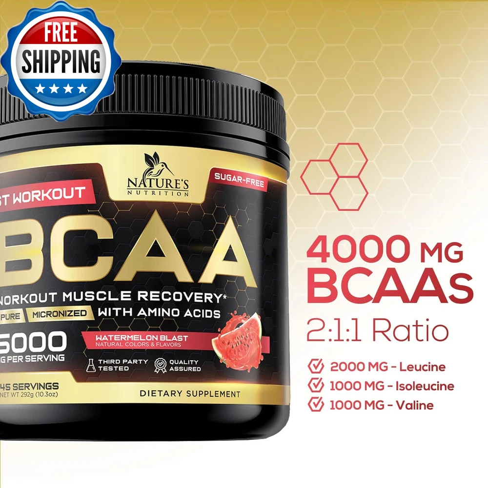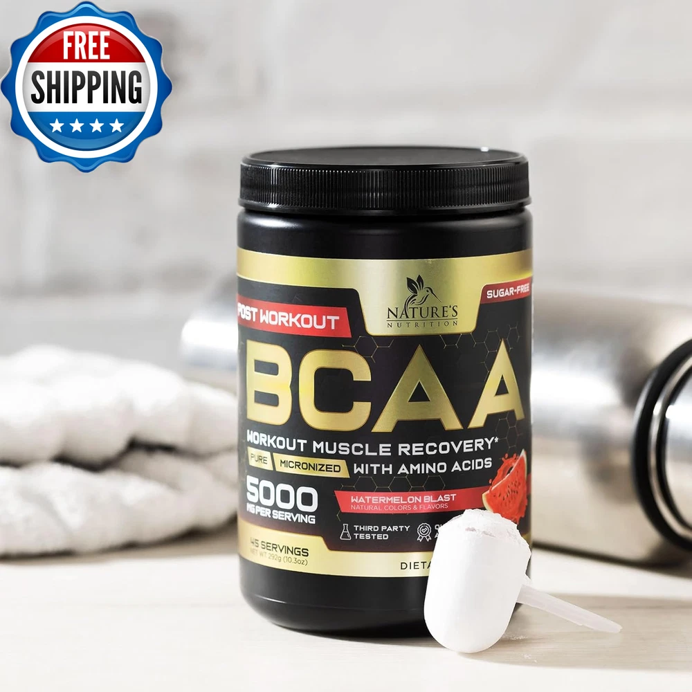 BCAA Powder, 4G Bcaas 2:1:1, 1G Glutamine, B6 - Pre Workout Drink Energy Boost & Post Workout Muscle Recovery Amino Acids Supplement for Men & Women - Keto, Sugar Free, Watermelon Flavor - 45 Servings BCAAS AMINO ACIDS POWDER: Each serving delivers 4g of branched chain amino acids (Leucine, Isoleucine and Valine in the optimal 2:1:1 ratio), plus 1g Glutamine, 2.5 mg Vitamin B6, as well as sea salt and trace minerals to support endurance, hydration, boost energy, combat fatigue, and support muscle recovery and growth VERSATILE BCAA WORKOUT DRINK: Perfect for pre, intra and post-workout use; provides essential amino acids for muscle support and recovery without caffeine or sugar KETO & SUGAR-FREE FORMULA: Ideal for those on ketogenic diets or looking for a sugar-free option, supporting workout performance and hydration without added carbs, and no artificial colors REFRESHING WATERMELON FLAVOR: Enjoy a delicious and refreshing BCAA powder workout supplement for women and men that supports hydration, recovery and overall workout performance in every scoop BRANCHED CHAIN AMINO ACIDS FOR MUSCLE GROWTH: Nature's Nutrition 2:1:1 BCAA Powder best pre work out after post workout drink mix natural essential aminos protein supplement complex bcaas electrolyte glutamine energy boost gym men women prework preworkout recovery branch bca acid supplements b6 fitness keto friendly bcca watermelon aminoacidos caffeine free zero sugar hydration endurance performance growth support bodybuilding strength training athletic sports fuel 30 90 211 aminoacids Product Description Unit Count 10.3 Ounce Number of Items 1 Product Benefits Muscle Growth Item Weight 0.39 Kilograms Special Ingredients Branched-Chain Amino Acid Age Range (Description) Adult Package Information Bottle Flavor Watermelon Item Form Powder Package Dimensions 5.75 x 3.74 x 3.66 inches; 13.76 ounces Shipping Fast shipping is very important for us. Our standard US shipping service is FREE. Your order will be shipped within 2-3 business days upon full payment received. Your order will be delivered within 2-3 business days after the handling time. We only ship to the confirmed PayPal address. We reserve the right to cancel any order for any reason at any time. We are not responsible for undeliverable addresses. Returns and payment We offer a 30 days return policy from checkout winning date. We allow only PayPal as payment method FeedBack Your feedback very important to us, after you get your package and you are satisfied with our service please leave us positive feedback If you have any problem with your order / any questions please before leave any type of feedback Please visit our eBay store to check out other items for sale! Thank you for shopping at our store.