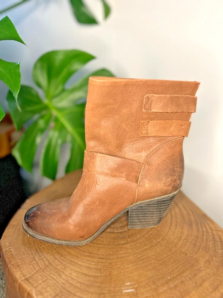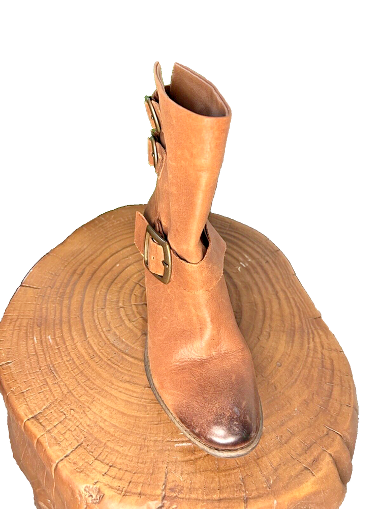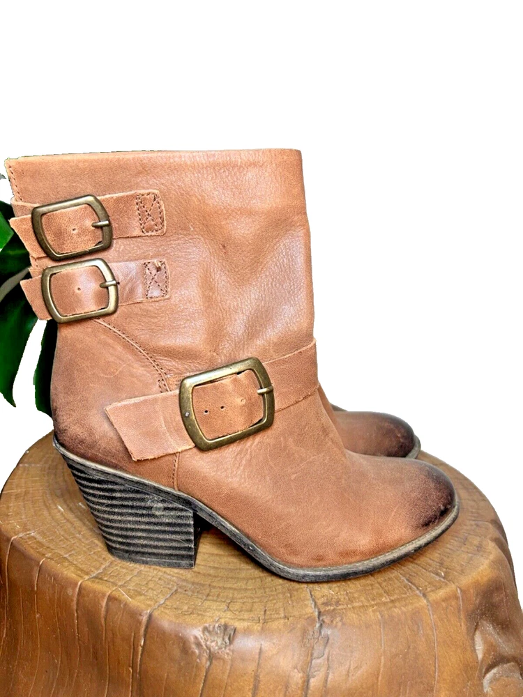Stylish BCBG booties in a beautiful distressed tan color with multiple buckles. These pull-on boots feature straps and are perfect for travel, casual outings, workwear, and business meetings. The leather upper and outsole provide durability, while the leather insole adds a touch of luxury. These boots are a size 7, which is equivalent to a EU size 37. The solid pattern are the same as the Lucky Brand Tommie Boot. Ideal for the winter, fall, and spring seasons, these BCBG Generation Toni Brown booties are a must-have for any fashion-forward woman.