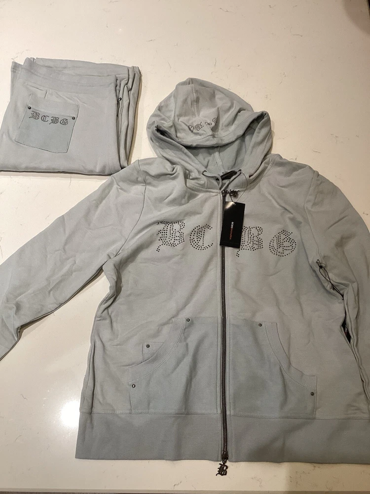 Elevate your activewear game with this stylish BCBG Max Azaria Fog Tracksuit in size XL. The gray sweatsuit features a comfortable French Terry fabric type made of a blend of spandex and cotton materials. The set includes a matching jacket and pants, perfect for any occasion from working out to running errands. The brand name speaks for itself, BCBGMAXAZRIA, and this tracksuit is no exception. The regular size type and women's department make it a versatile addition to any wardrobe. Stay comfortable and stylish while you move with this fashionable tracksuit.