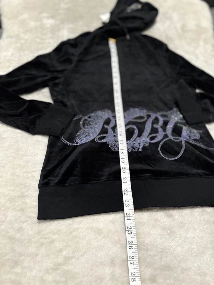 BCBG Max Azria Black Velour Track Suit Set Sz SM Sequin Embellish Pants Hood Y2K