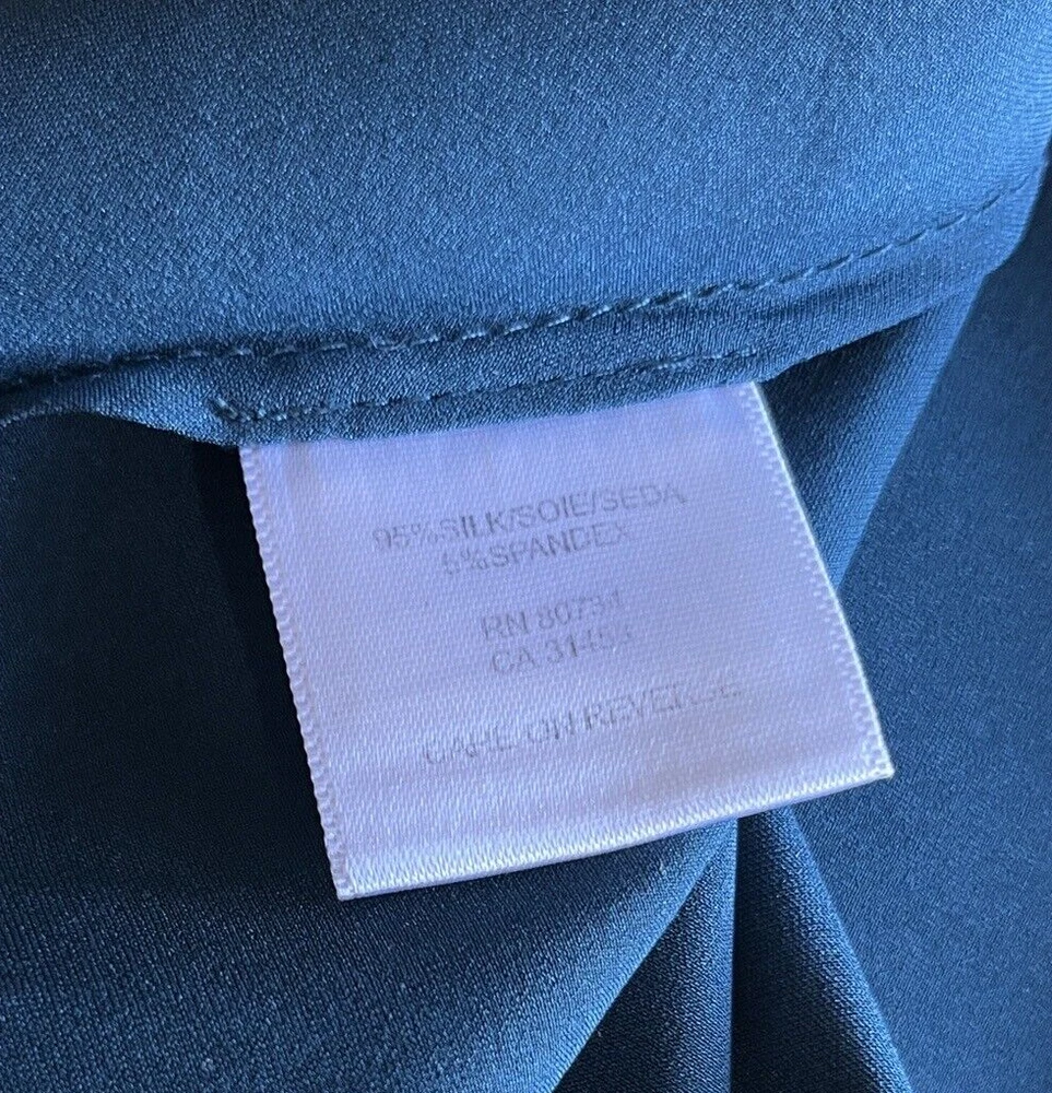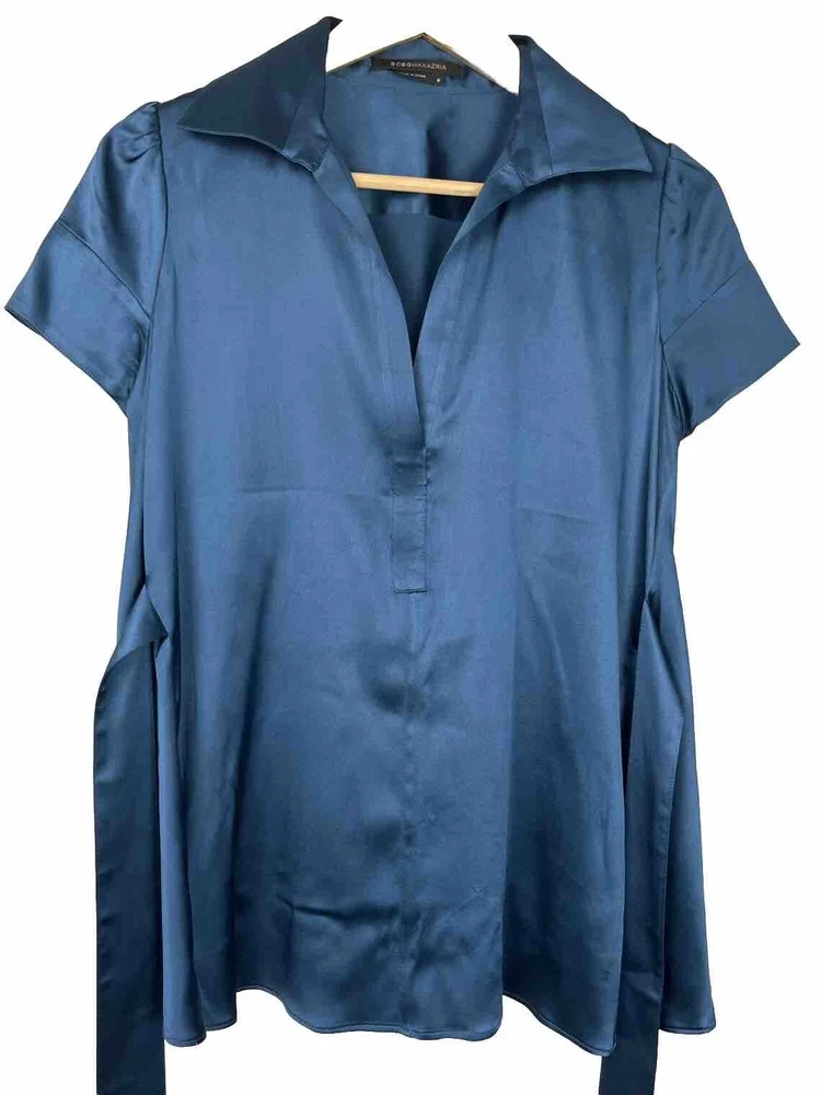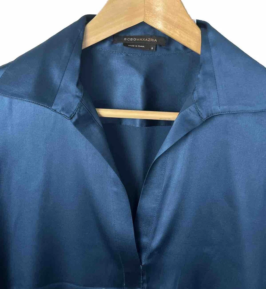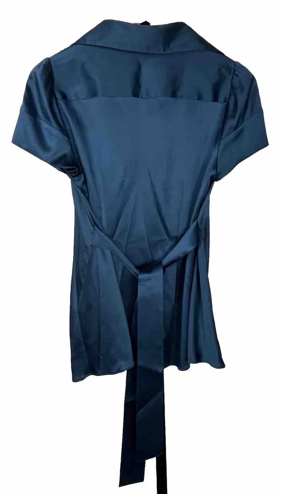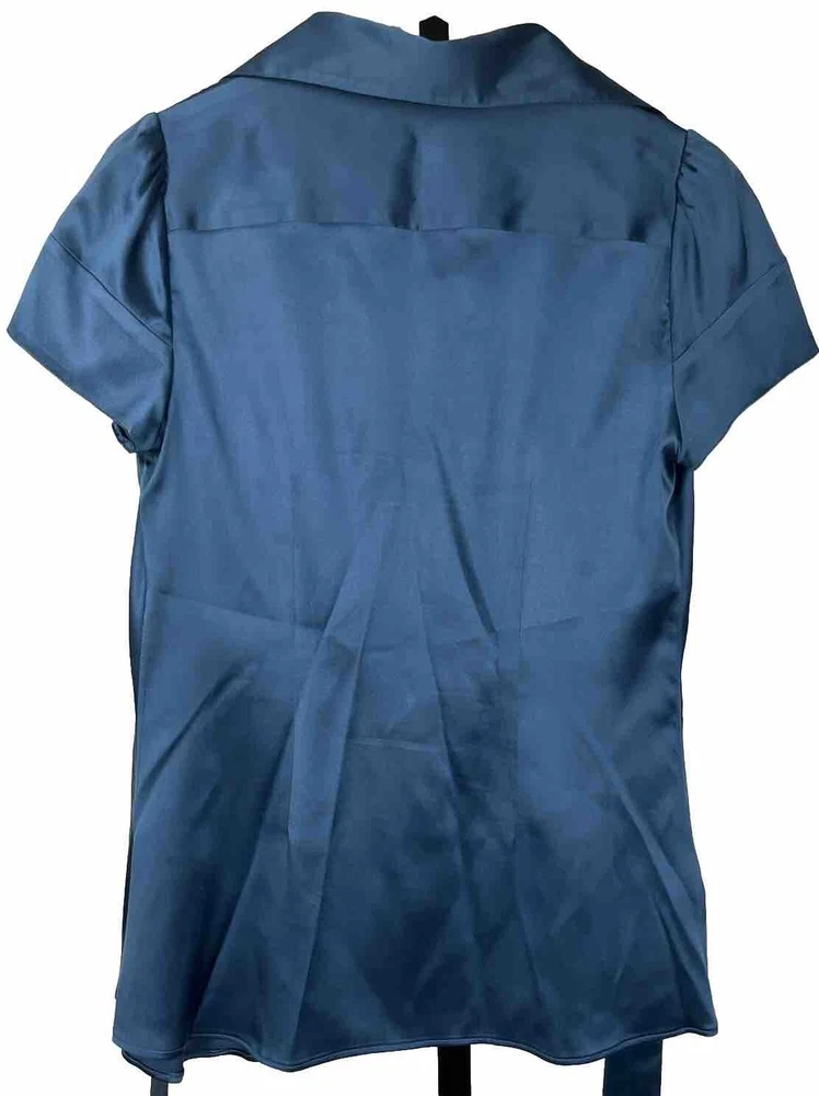 BCBG Max Azria Blouse Women's Size Small Blue Satin Pullover Tie Waist Career Classic V Neck Collar Bust 38 Length 28 inches. 95% Silk 5% Spandex