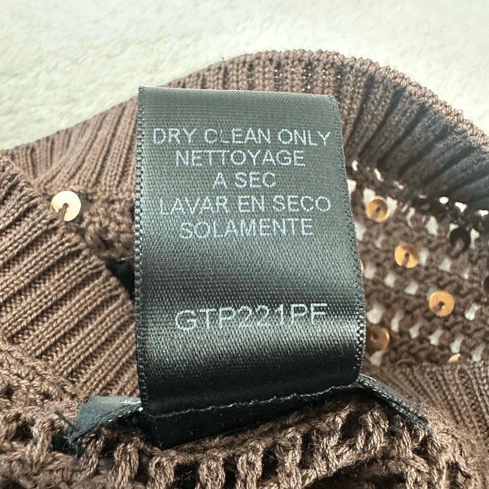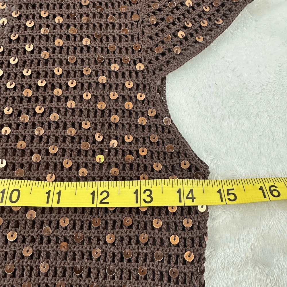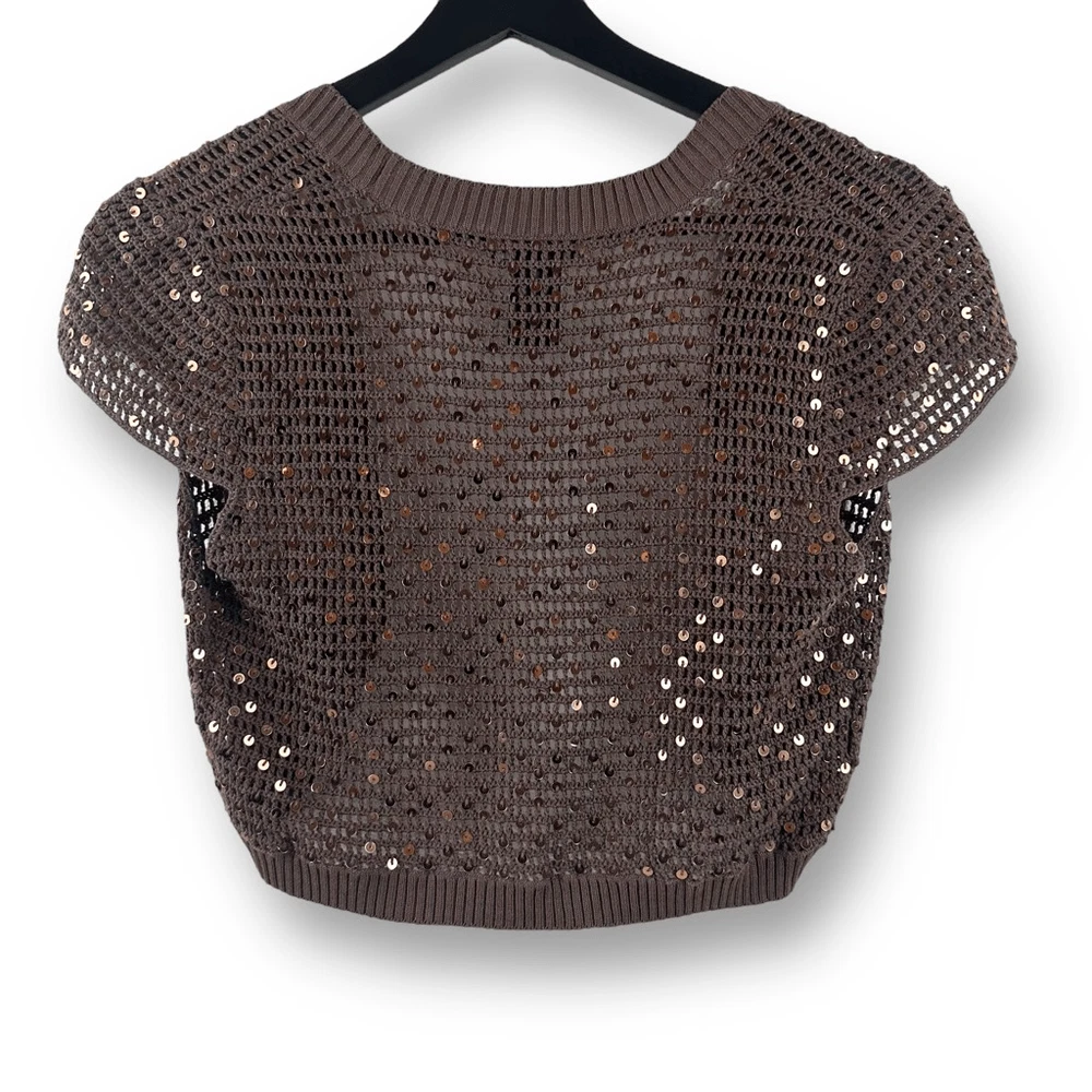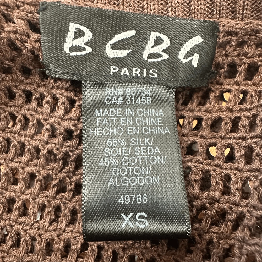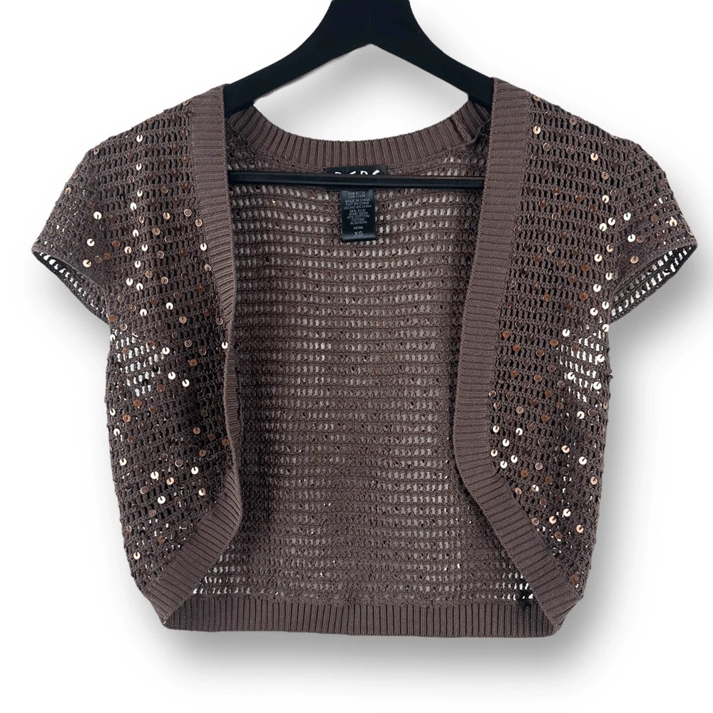 BCBG Women's XS Brown Sequin Metallic Open Knit Shrug Iconic Celeb Style Y2K Size XS- See photos for approximate measurements Preowned/gently used Ships fast Ships from a smoke free pet friendly home