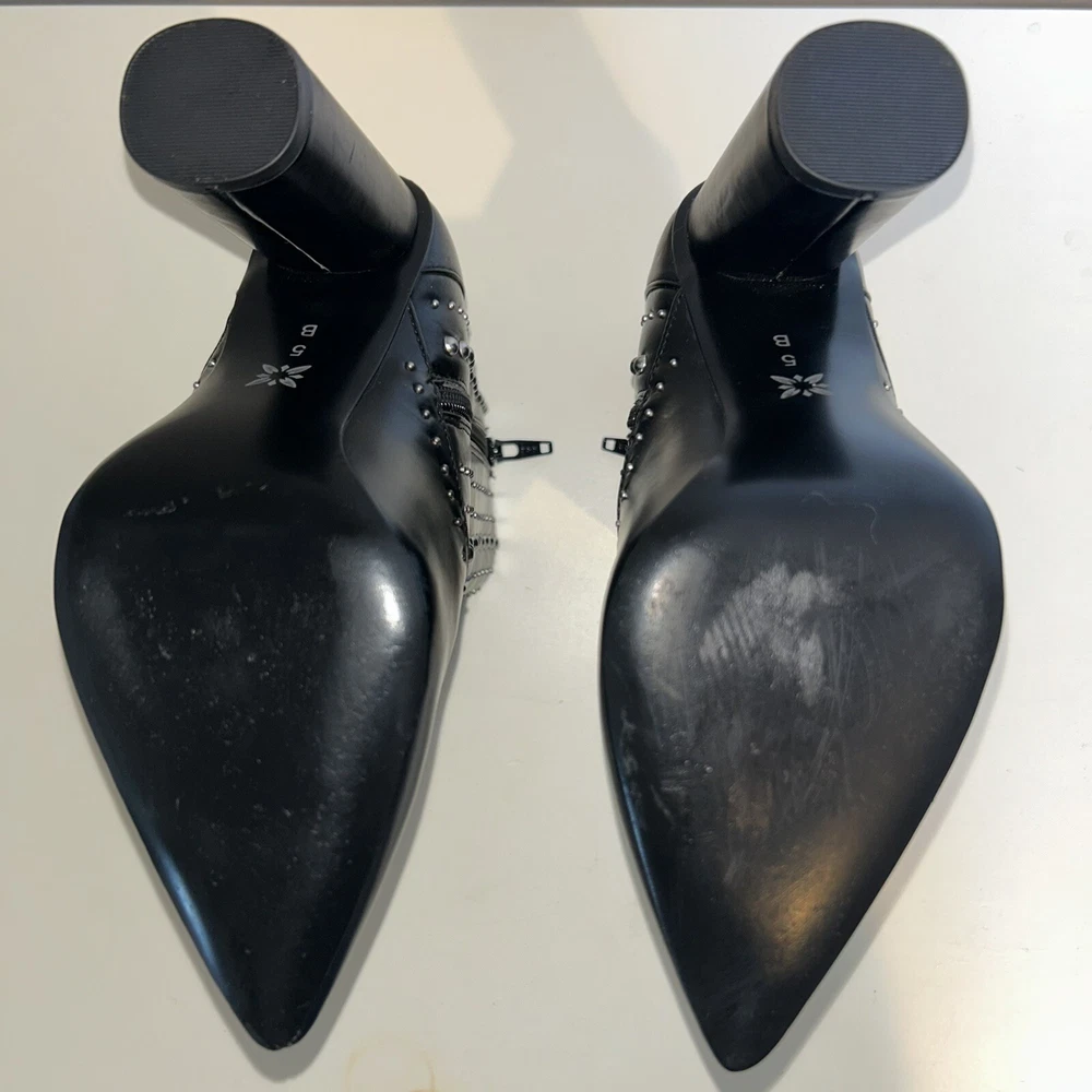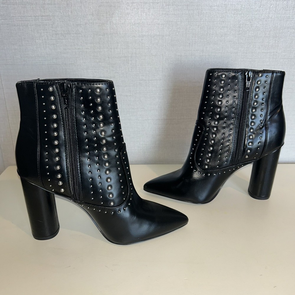 Elevate your style with these stunning BCBGeneration boots in black. With a pointed toe and high block heel, these ankle booties are perfect for any occasion, from casual to formal. The studded accents add a touch of glamour to the faux leather upper material, making them a great addition to your wardrobe. These boots are designed for women and come in size 5B. They are perfect for parties, cocktail events, or simply for everyday wear. The Boots character adds a touch of sophistication to your outfit, while the Comfort and Style category ensures that you will feel confident and comfortable all day long. Don't miss out on these must-have booties from BCBGeneration.