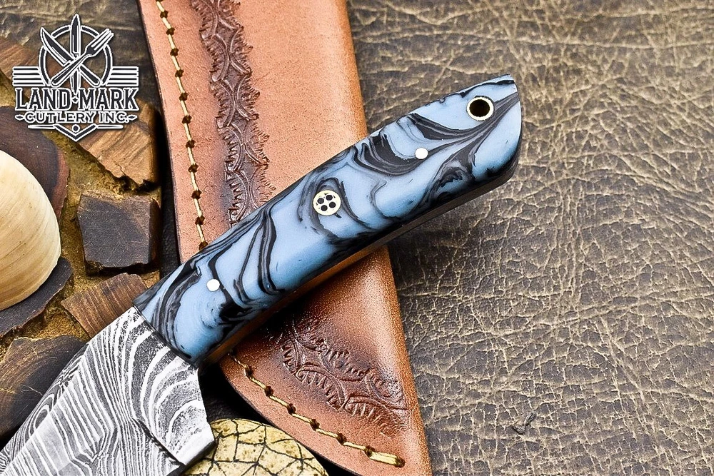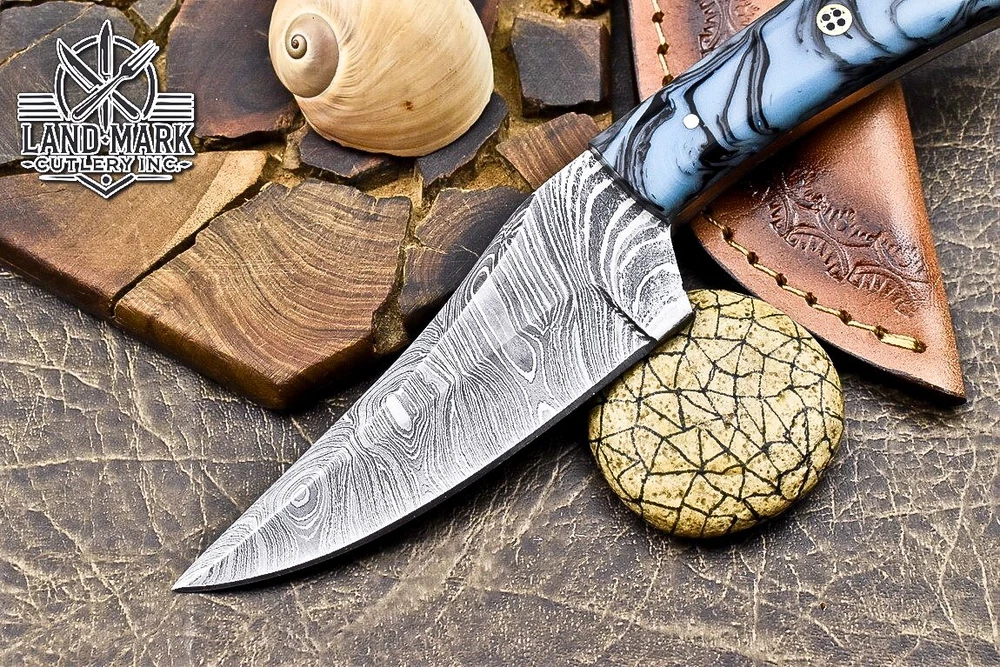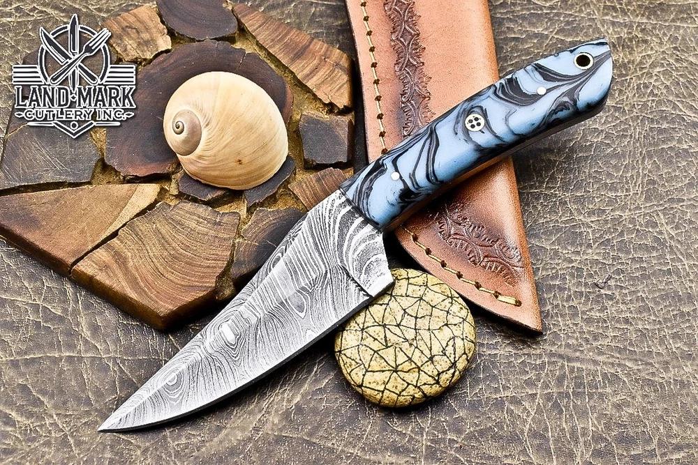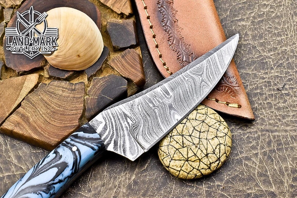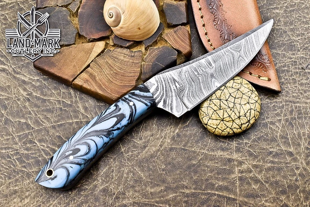 Custom Hand Made DAMASCUS STEEL HUNTING KNIFE WITH RESIN HANDLE We offer a shipping discount for More then one purchased . And discount will be apply on combine invoice, Discount will not apply on separate payment. ITEM DETAILS OVER ALL LENGTH 8.0 inches long (Approx) HANDLE LENGTH 4.0 inches long (Approx) BLADE LENGTH 4.0 inches long (Approx) BLADE HARDNESS 58-60 HRC Which Holds The Sharp Edge For Long Time. HANDLE RESIN COVER LEATHER SHEATH This Awesome custom made KNIFE has a nice hand forged with the combination of 4340 & 1080 steel. HOW OUR DAMASCUS IS MADE: All our Damascus is real and not just an acid etch. Damascus is a mixture of 1080HC and 4340 nickel carbon. You heat them up together and then fold the bar over and over to get the desired layers, ours are 396 layers. Then you burn the blade in acid, and it turns the nickel satin color and the high carbon turns blackish gray. This is how the layers are exposed to show the layers of the new steel created coined "Damascus". All Damascus is acid etched to show the layers. If you high polish the metal it will be shinny satin like all steels. Only after you burn the sides of the blade with acid do you see the layers of the two steels. Makes sense? After we make our knives we high polish the handles and put an edge on the blade. The high polishing buffs off the acid burned layer of the handle, and the blade edge is sharpened and the acid burned edge becomes satin. You can re-burn the tang of the blade near the handles and the edge of the blade and it will show the layers once more. All our knives are hand made, durable and unique ***** YOU WILL RECEIVED THE SAME KNIFE Qality Standards Our Damascus blades are made from high quality non-stainless steels which rival or exceed any Damascus blade made from the 10 series with 4340. Our Damascus combination has taken years to perfect and has been tested under a variety of application which will offer professional performance in categories of toughness, strength (lateral stress) and edge honing and holding ability. In a 5 spot Rockwell test our blades will average near or close to 58 which offers a perfect balances between its toughness and strength.Our blades due to carbon content need to be regularly treated with wax and/or 3 in 1 oil to maintain its superior quality. Questions if you have any question feel free to send us message we aim to answer all questions within 24 hours Feedback If you are not satisfied with our service please contact us before leaving any negative or natural feedback. We will resolve all issues as quickly as possible. Disclaimer We are not responsible for any injuries associated with the use of our tools. Our products are intended for legal use only by responsible buyers. Therefore, we will not sell our products to anyone under the age of 18. Before bidding please check your country laws as some countries Custom don't allow this. If your purchase is held by Custom Authorities in your country/State we will not be responsible for that and no refund will be issued Shipping We offer a 20% shipping discount for More then one purchased . And discount will be apply on combine invoice, Discount will not apply on separate payment We ship within 24 hours after receiving complete payment but this can be delayed due to week ends or Governments and Religious Festivals . . This is beyond our control and we apologize for this inconvenience. Precautions Our Tools are very sharp so open and use them very carefully We are not responsible for any injuries associated with the use of our tools Tips to Care knife 1. NEVER STORE YOUR KNIFE FOR LONG TIME IN LEATHER SHEATH. 2. LEATHER CAN ABSORB WATER, WHICH WILL RUST THE KNIFE. 3. ALWAYS CLEAN THE BLADE AFTER USING WITH OIL OR WAX
