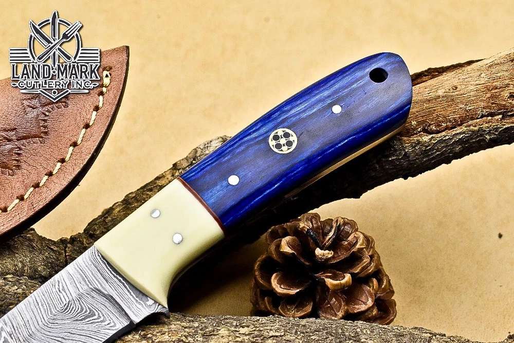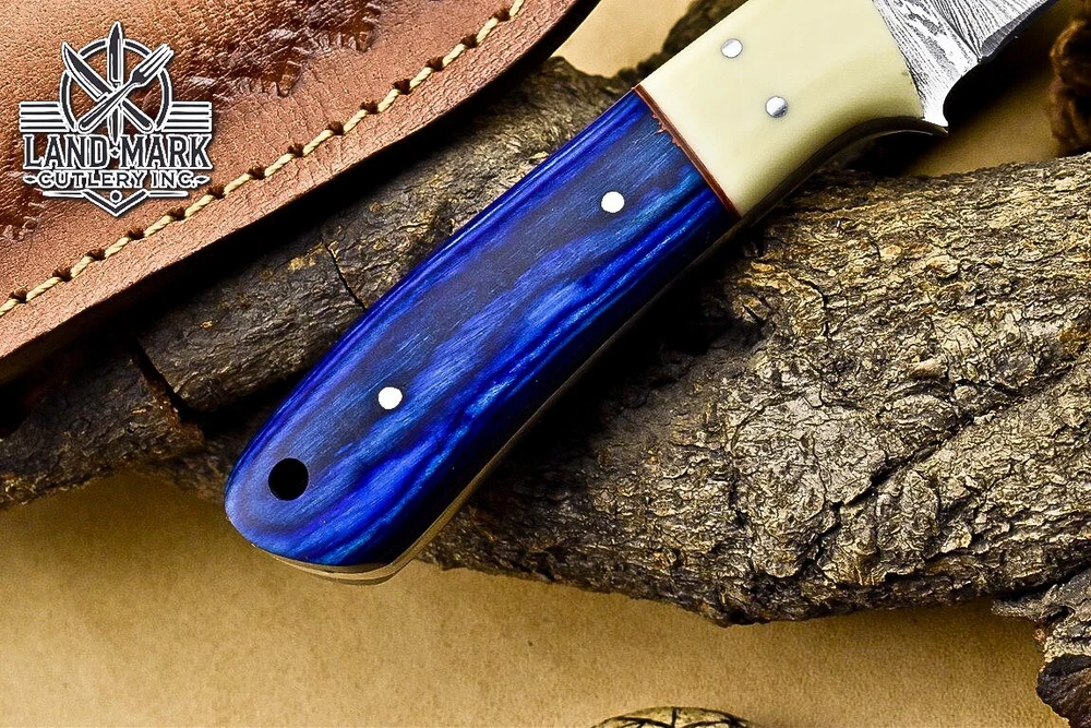 BEAUTIFUL DAMASCUS HUNTING SKINNER KNIFE WITH PAKKA WOOD & BONE BOLSTER HANDLE