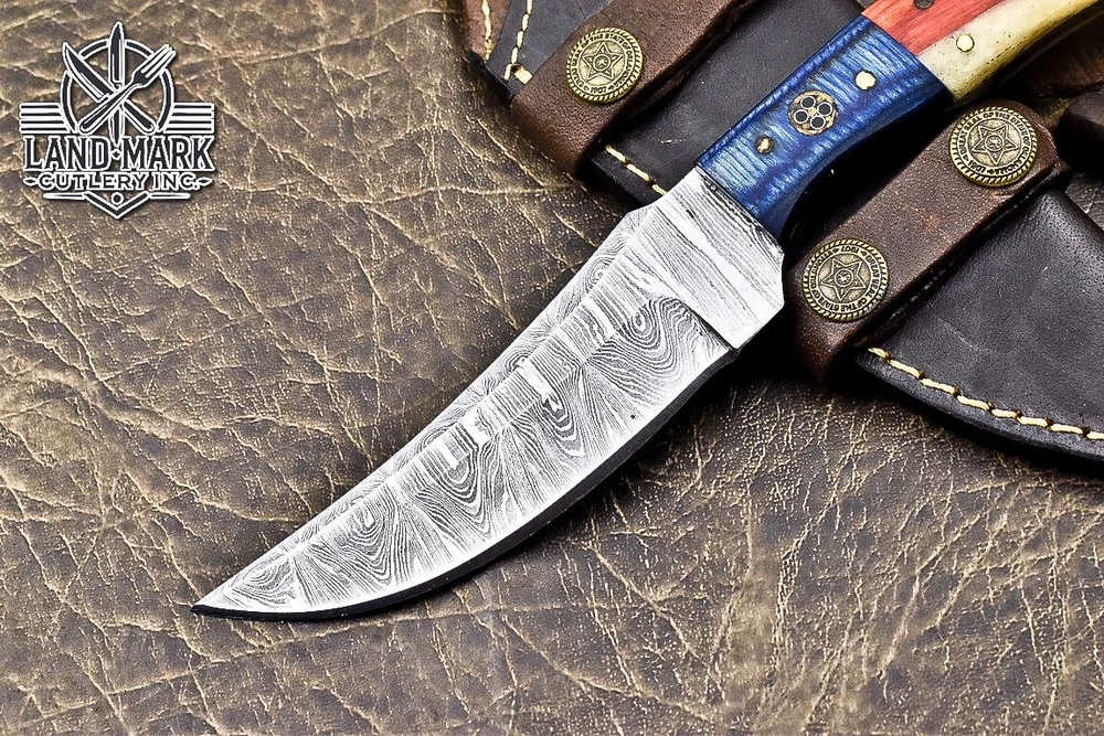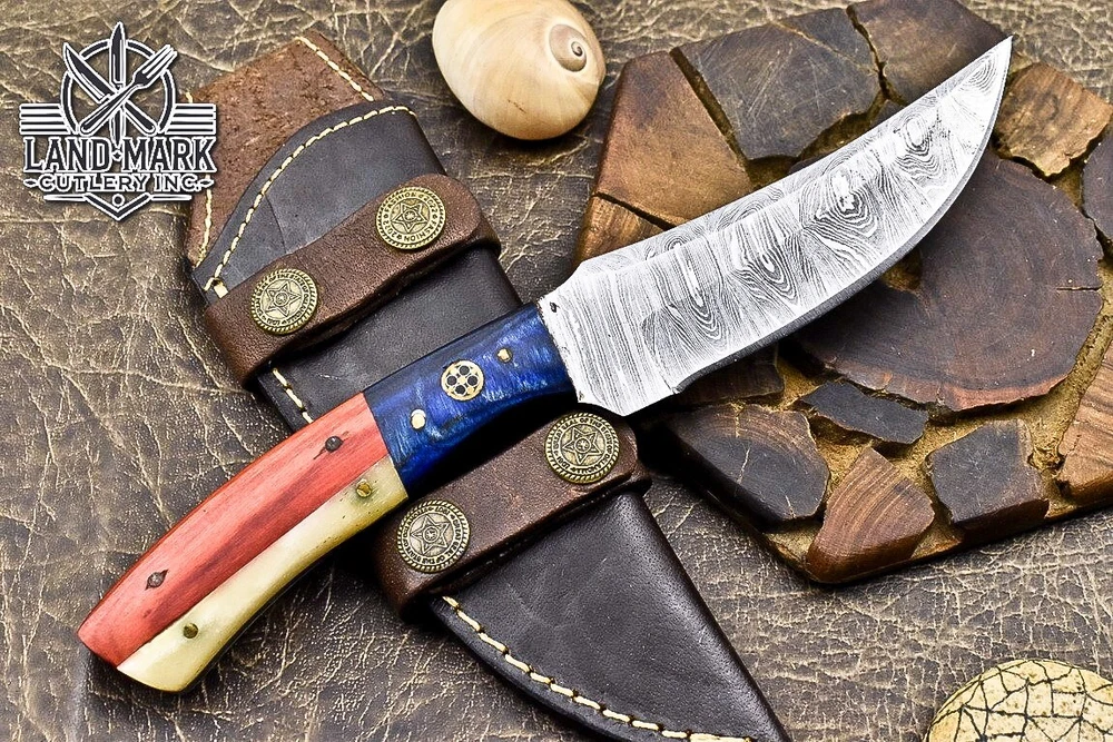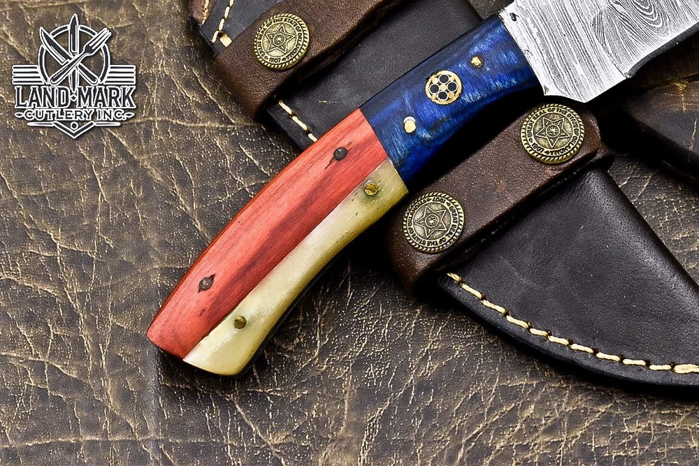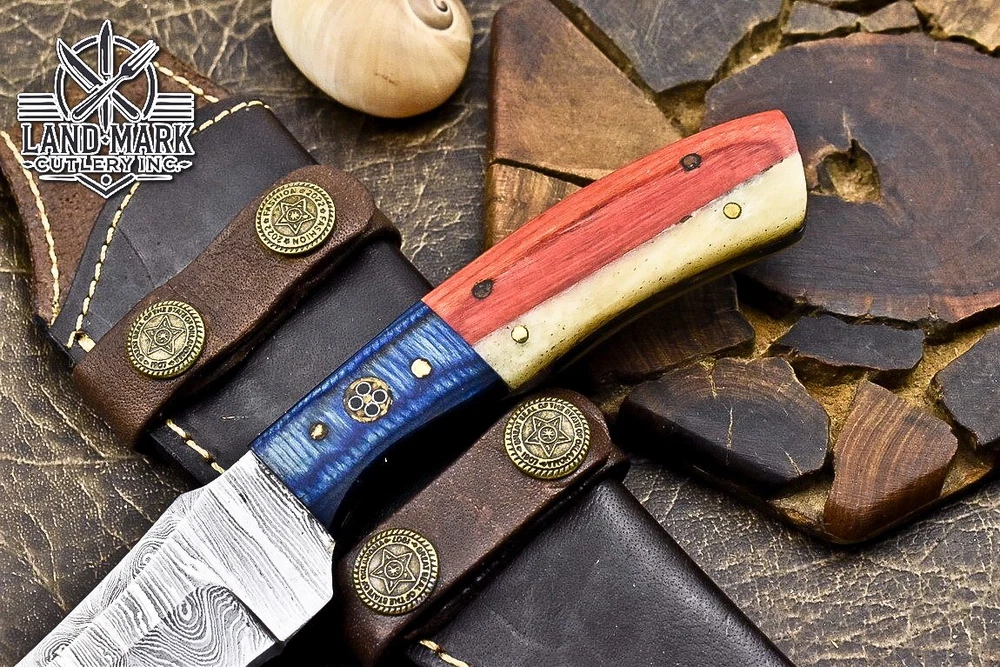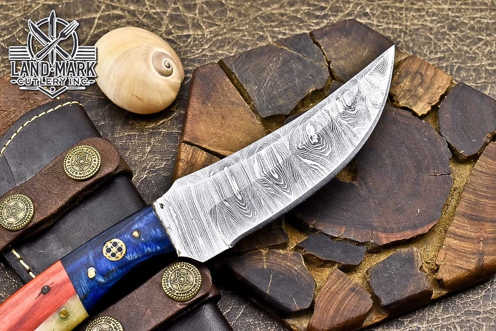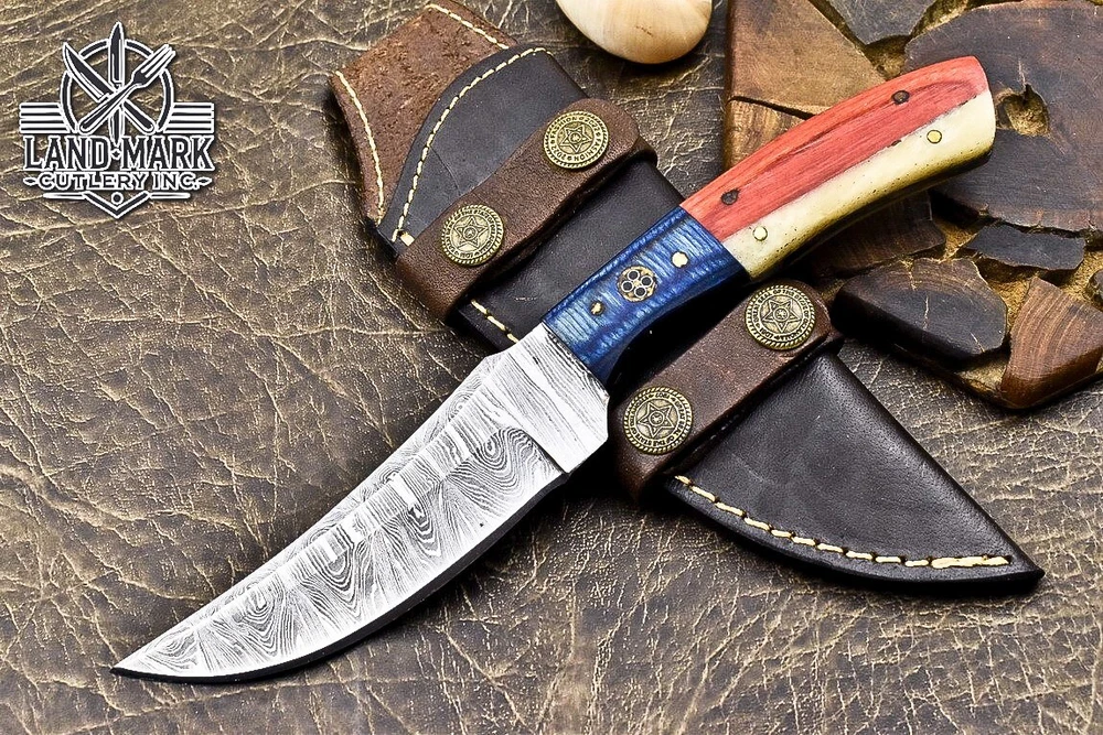 BEAUTIFUL DAMASCUS HUNTING SKINNER KNIFE WITH WOOD BEAUTIFUL FLAG HANDLE