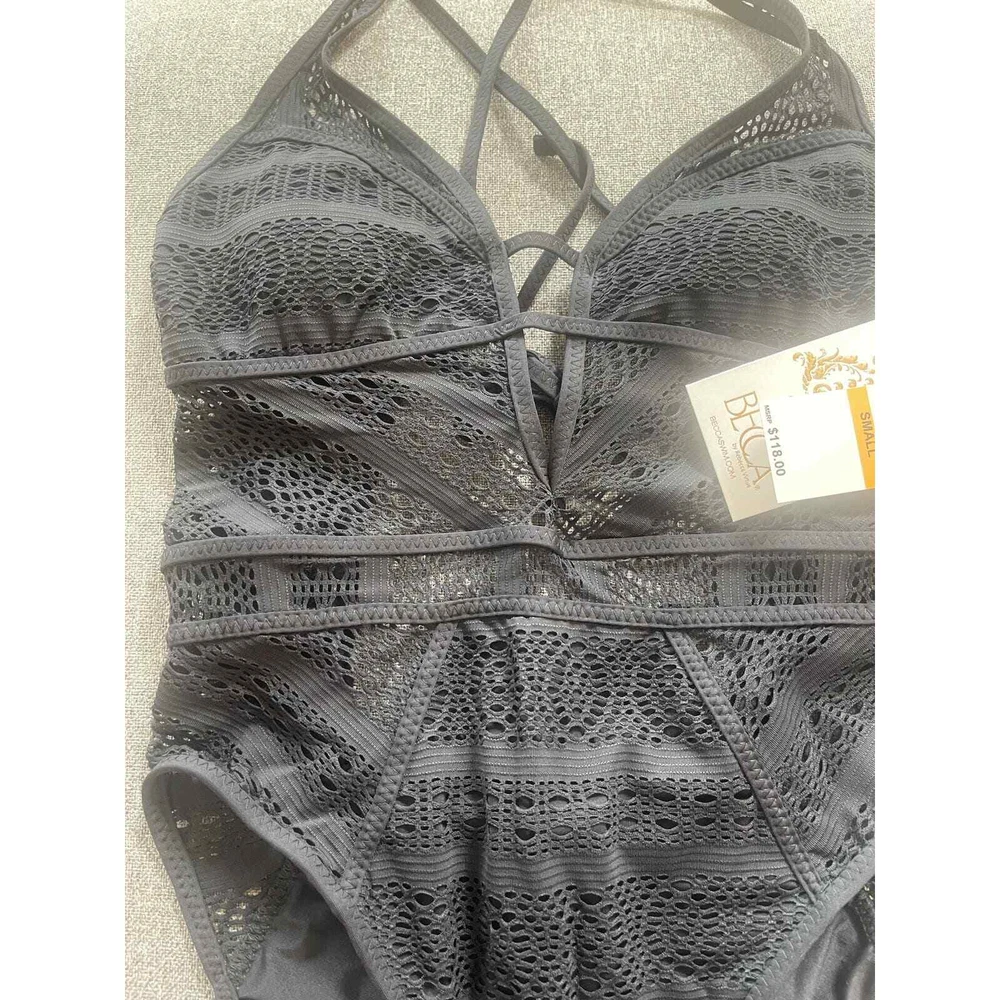 Finished with crochet detailing throughout, this one-piece keyhole swimsuit from Becca will have you looking fierce by the pool. Moderate bottom coverage Lined Plunging neckline Removable soft cups; no underwire Pull-on styling; adjustable shoulder straps Imported Crochet detailing throughout