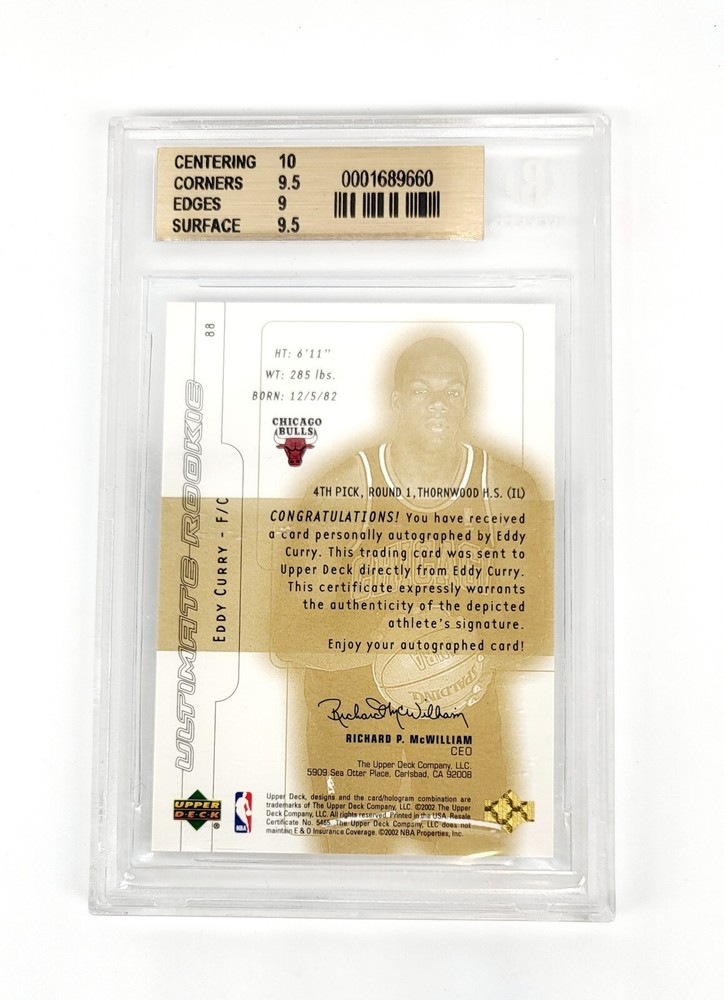 This limited edition sports trading card features Eddy Curry of the Chicago Bulls during the 2001 NBA season. Graded 9.5 gem mint by Beckett, this card is a part of the 2001-02 Upper Deck Ultimate Collection, Gold Signatures parallel/variety, and is serial numbered with a print run of only 250. The card is autographed by Curry and authenticated by Upper Deck, with a hard signed autograph format. This rookie card is a 1st edition, chase, exclusive, and short print with the features of AU,SN,RC, and Parallel/Variety. It is a must-have for any basketball fan and collector.
