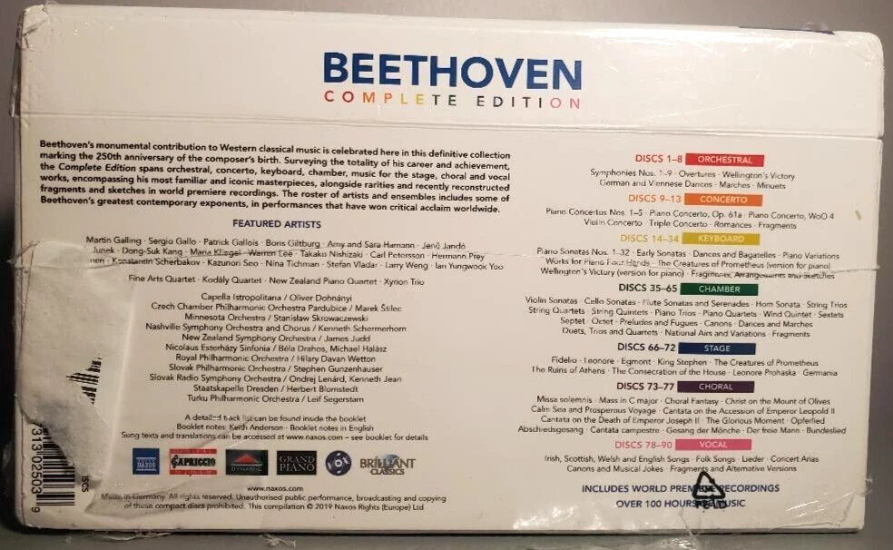 This Beethoven Complete Edition is a must-have for any classical music lover. With over 90 CDs, this box set includes all of Beethoven's major works, performed by some of the finest artists of our time. The CD grading is Mint (M), and the case is unopened, with a near-mint (NM or M-) case condition. The inlay is also in mint (M) condition. This complete edition was released in 2019 and comes sealed in its original packaging. It is a rare opportunity to own a complete collection of Beethoven's music, and it is a perfect addition to any music library. This collection is still shrink wrapped and the cds are in mint condition. This makes a great gift for the classical music enthusiast. Thanks for looking.