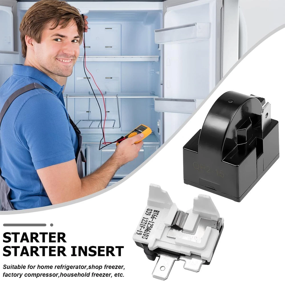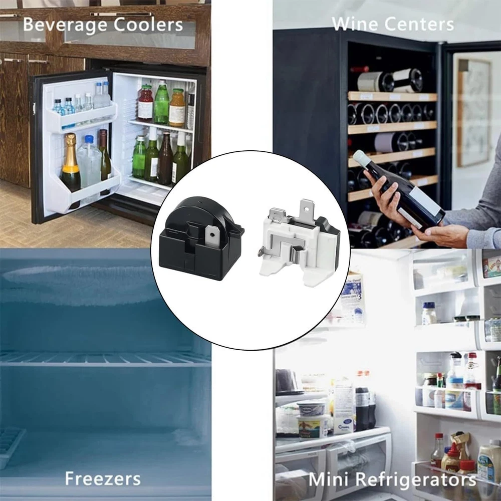 BELOMI 2PCS QP2-4.7 1Pin Refrigerator Starter Relay and 6750C-0005P Overload Protector, Mini Fridge Start Relay Parts Replacement, Compatiable with Most Refrigerator Cooler Compressor Product Details Contact Material: Silver Or Copper Contact Type: Normally Open Brand: BELOMI Operation Mode: Automatic Coil Resistance: 4.7 Ohms 【Starting Assistance】: This refrigerator start relay is a single pin. Since compressor startup instantly requires a higher current than during normal operation, this start relay is able to provide startup assistance. It can provide an instantaneous high current pulse when the refrigerator compressor starts to help the compressor's motor overcome the initial starting resistance and start running smoothly. 【Overload Protection】: The 6750C-0005P overload protector is a very practical device. It can detect an abnormally high current during compressor operation (usually caused by overheating of the compressor, mechanical failure, or voltage instability), this protector will quickly cut off the power supply to prevent the compressor from being damaged due to overloading. 【Energy-Saving】: Starting the compressor through the relay prevents high current from passing directly through the main control circuit of the refrigerator, which prolongs the service life of the appliance. Moreover, after the start is completed, the relay only maintains a small maintenance current, which reduces energy consumption and improves energy utilization efficiency. 【Package Content】: You will receive a QP2-4.7 1pin refrigerator start relay and a 6750C-0005P overload protector. Together, these two devices form a safeguard system for the safe start and operation of the refrigerator compressor, ensuring efficient and safe operation of the refrigerator.