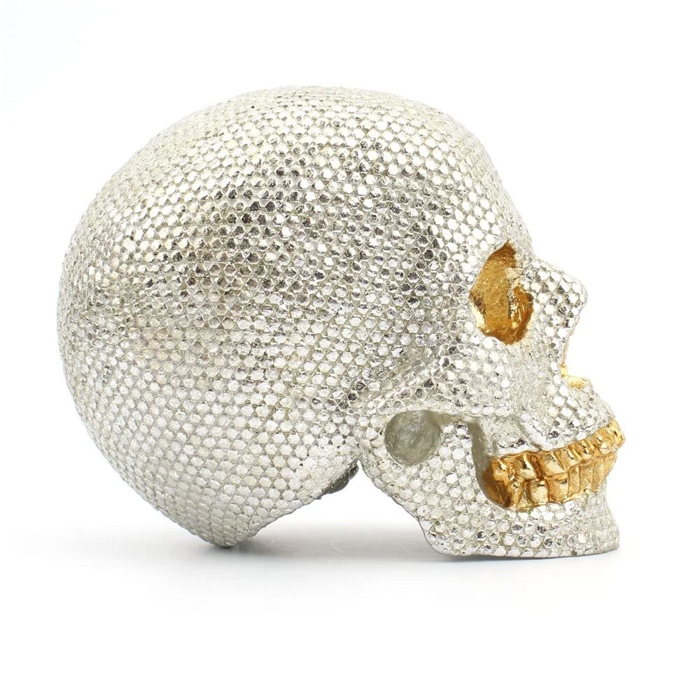 Small Size Human Skull Resin Statue Head Sculptures Skull Collectible Figurines This skull organizer is made of designer composite resin, hand painted and polished individually. Halloween Crystal Skull Figurine A dazzling artificial water drilling chrome bone. It has a shiny factor on the skull, no matter where you decide it, it will give a beautiful factor. Set it with your candles to get beautiful illumination reflections! Decorate your home for the halloween, day of the dead season or any season with this skull. This Collectibles makes a great gift for any Skull lover and adds a whimsical touch to your Decor.
