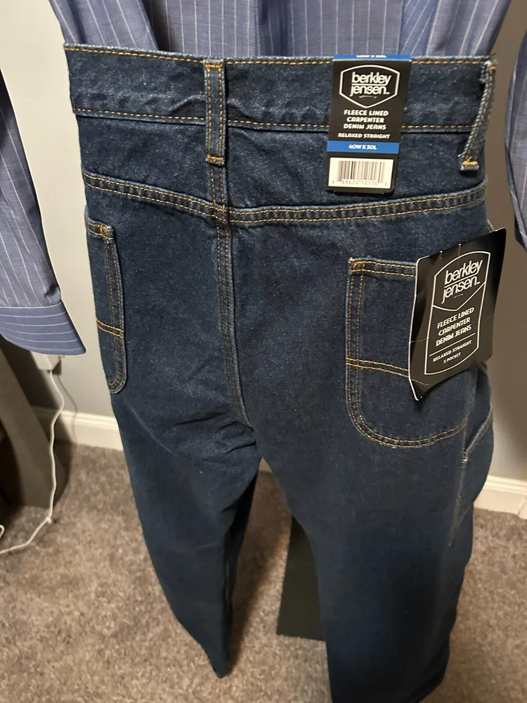 Elevate your style with these Berkley Jensen carpenter jeans. The dark denim and fleece lining make them perfect for winter, fall, and spring. The relaxed fit and high-rise waist provide comfort and style, while the 5-pocket design with slash pockets and cargo pockets offers ample storage space. The zip closure and cotton material make these jeans easy to care for and machine washable. The solid pattern and blue color add a touch of sophistication, and the carpenter jeans theme is perfect for any occasion. Order now to add these Berkley Jensen carpenter jeans to your wardrobe. CONDITION NEW WITH TAGS MEASUREMENTS WAIST 40 INCHES INSEAM 30 INCHES MATERIAL CONTENT 100% COTTON COLOR DARK DENIM
