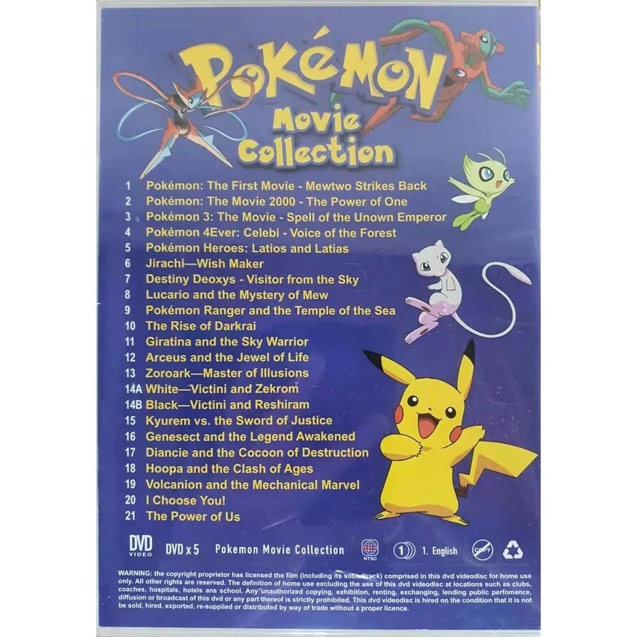 *All Item Packed With Bubble Wrap *Item sold are original with Malaysia Government Hologram *As the seller, we shall not be liable for any extra cost/ charge/ tax imposed by your custom upon arrival. BRAND NEW JAPANESE ANIME DVD DVD Japanese Anime Pokemon 21 Movie Collection English Dubbed DESCRIPTION : Title: Pokemon Episode: 21 Movie Condition: New and Sealed No of Discs : DVD x 5 Language : English Subtitle : English Model : DVD Pokemon Movie Collection DVD No of Disc : 5 Discs Version : English 1) Pokemon : The First Movie - Mewtwo Strikes Back 2) Pokemon : The Movie 2000 - The Power of One 3) Pokemon3 : The Movie - Spell of The Unown Emperor 4) Pokemon 4Ever : Celebi - Voice of The Forest 5) Pokemon Heroes : Latios and Latias 6) Jirachi - Wish Maker 7) Destiny Deoxys- Visitor from The Sky 8) Lucario and the Mystery Of Mew 9) Pokemon Ranger and the Temple of the Sea 10) The Rise of Darkrai 11) Giratina and the Sky Warrior 12) Arceus and the Jewel of Life 13) Zoroark - Master of lllusions 14A) White - Victini and Zekrom 14B) Black - Victini and Reshiram 15) Kyurem vs. the Sword of Justice 16) Genesect and the Legend Awakened 17) Diancie and the Cocoon of Destruction 18) Hoopa and the Clash of Ages 19) Volcanion and the Mechanical Marvel 20) I Choose You ! 21) The Power of Us