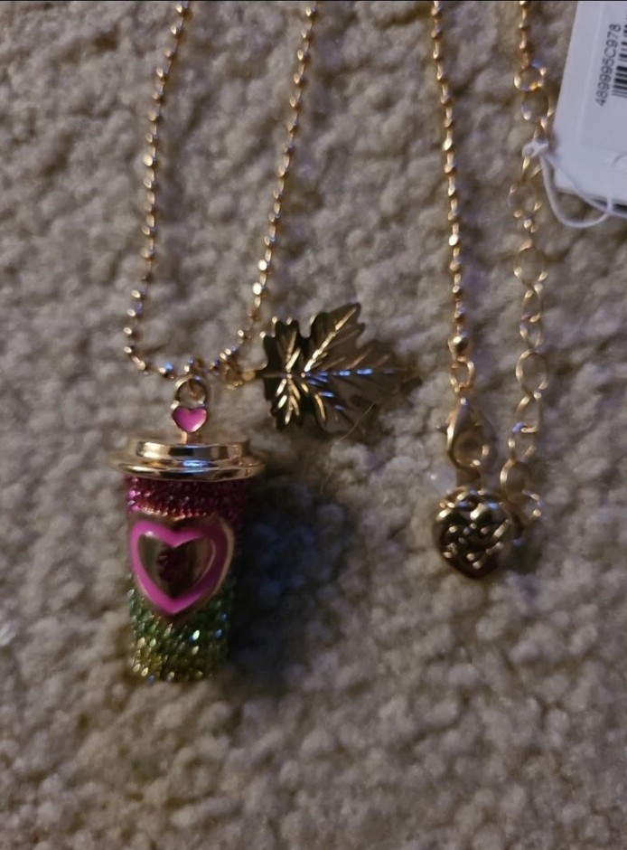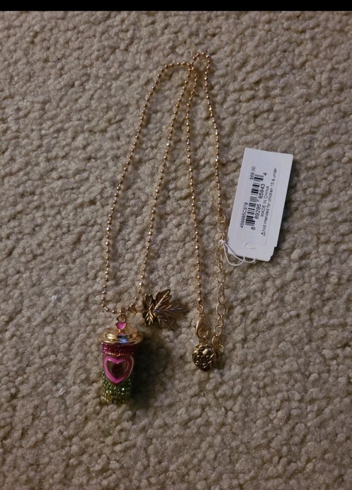 CNWT BETSEY JOHNSON COFFEE CUP GOLD TONE OMBRÉ STONES LOCKET BALL CHAIN NECKLACE - FEATURING AN EMBELLISHED OMBRÉ RAINBOW GLASS STONES HINGED COFFEE CUP ADORNED WITH A GOLD TONE MAPLE LEAF. - MATERIALS: BRASS/ GLASS STONES & COATED ENAMEL - LOBSTER CLASP CLOSURE - 19'L + 3" EXTENDER -COFFEE CUP PENDANT: 1.25'H x 0.5"W-0.85"W MAPLE LEAF 1.0'H × 0.75'W