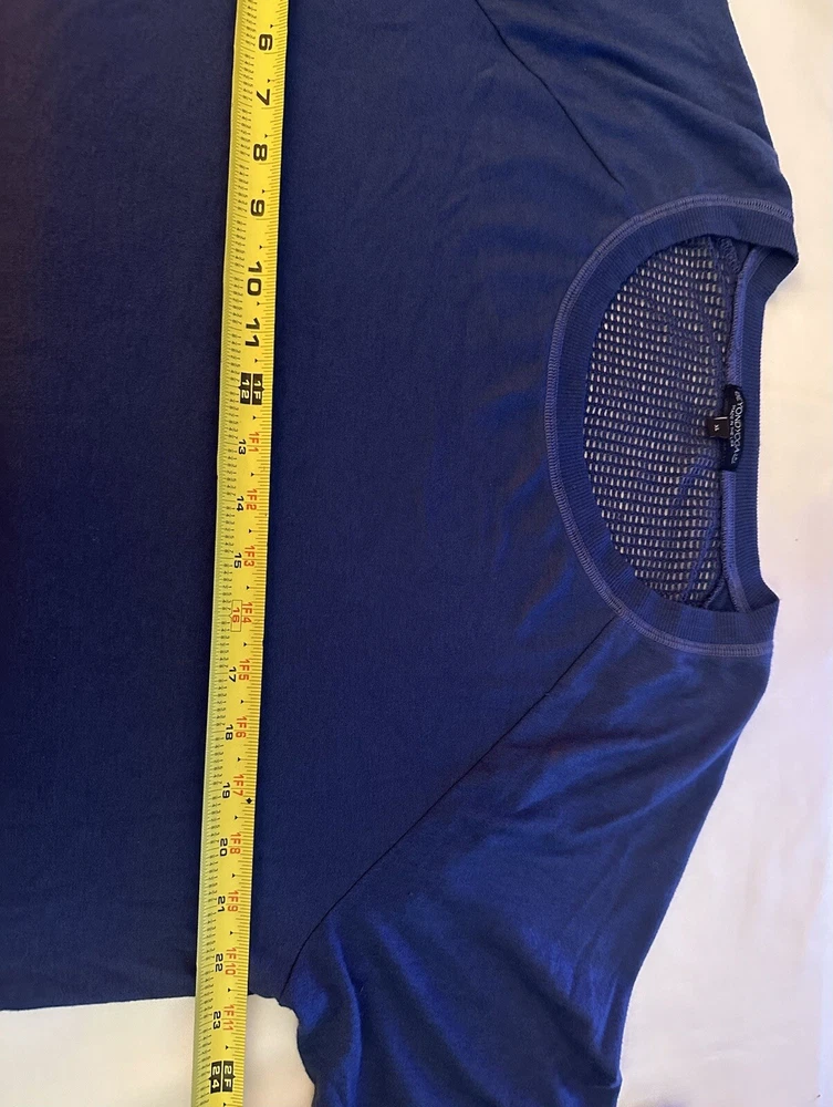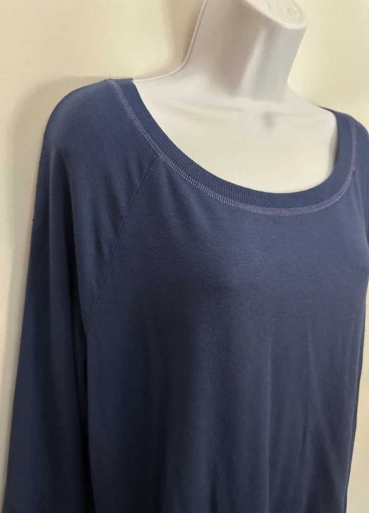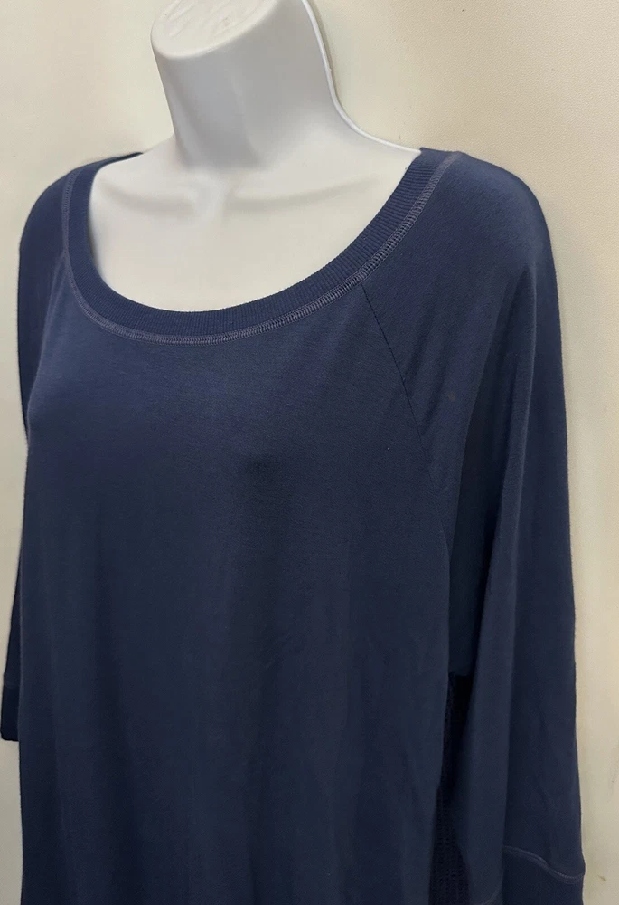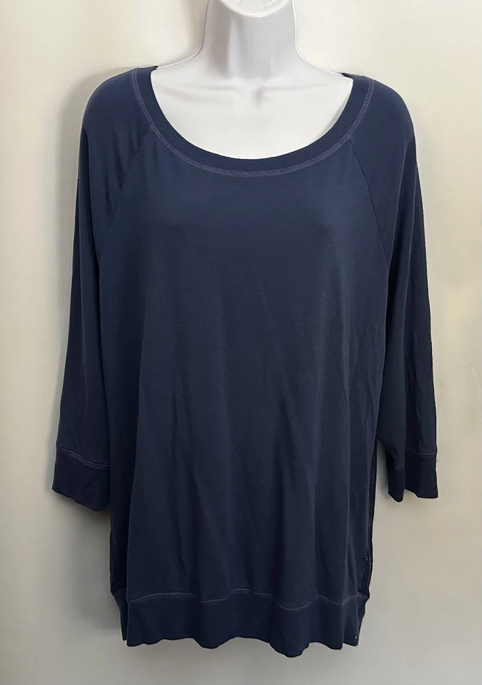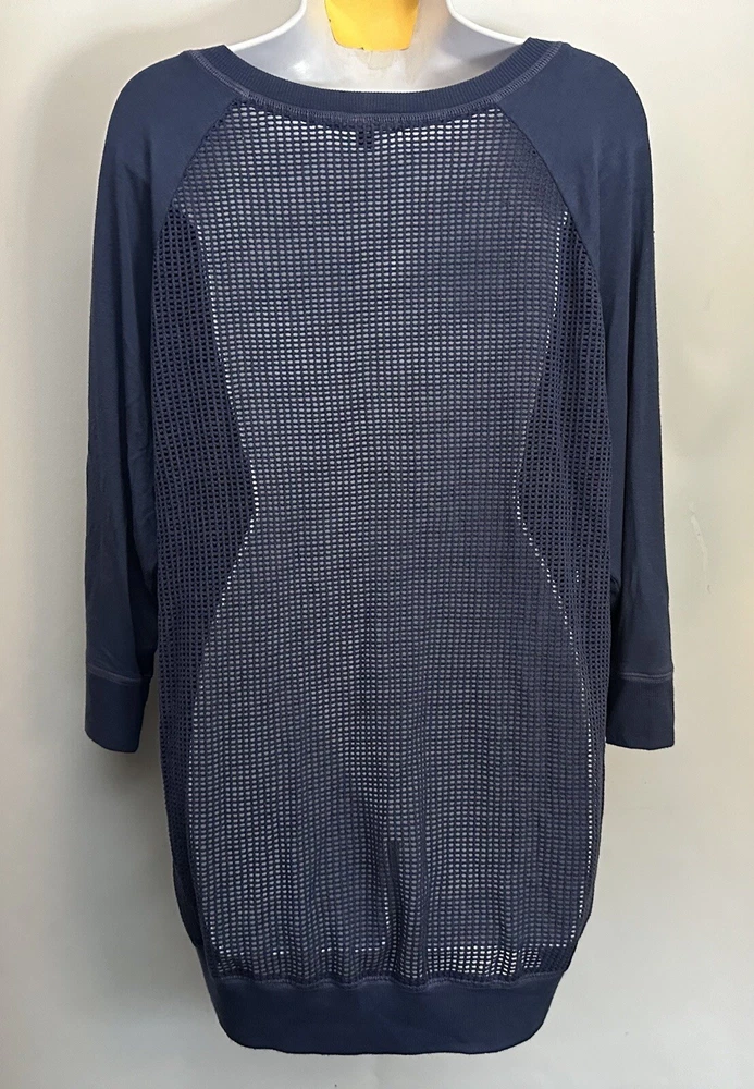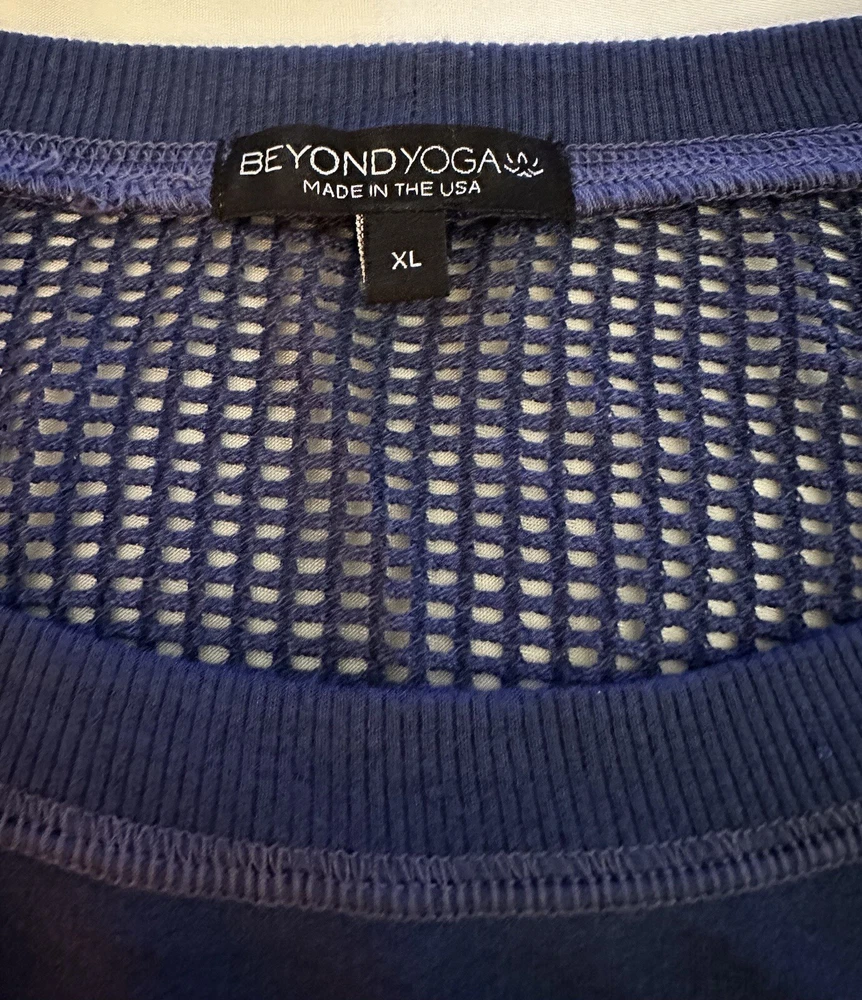 This Beyond Yoga sweater blouse, made in the USA is the perfect combination of comfort and style. The XL size pullover features a solid pattern in a blue color, with a round neckline and 3/4 sleeves. No fabric tag but this garment is made from a blend of polyester, spandex, and cotton, and the mesh fabric provides breathability in the back area. Ribbed details on hem, cuff and neckline. This Beyond Yoga sweater blouse is a must-have for any fitness enthusiast looking for a comfortable and stylish addition to their activewear collection. Measurements: Armpit to armpit: 22.5” Shoulder to hem: 27” FLAT FEE NEXT DAY SHIPPING WITHIN THE US