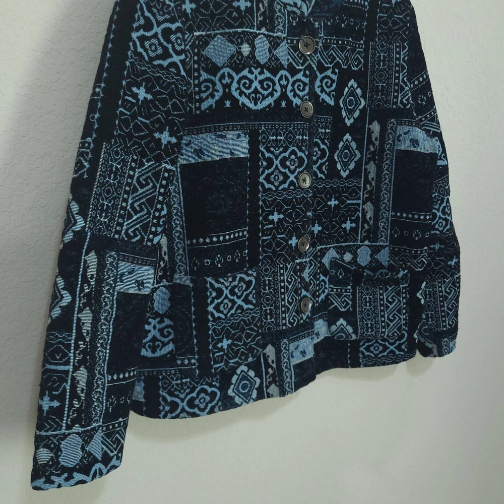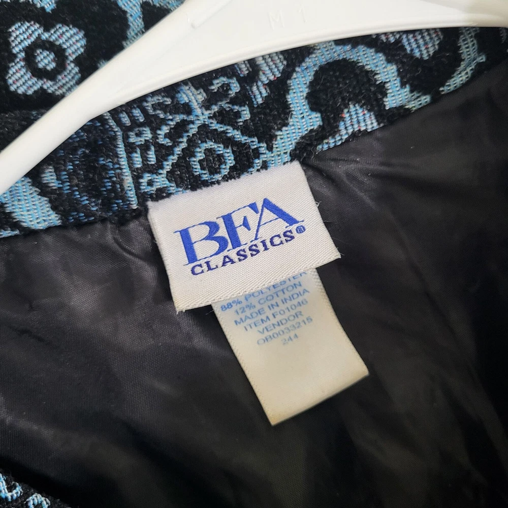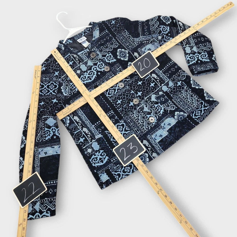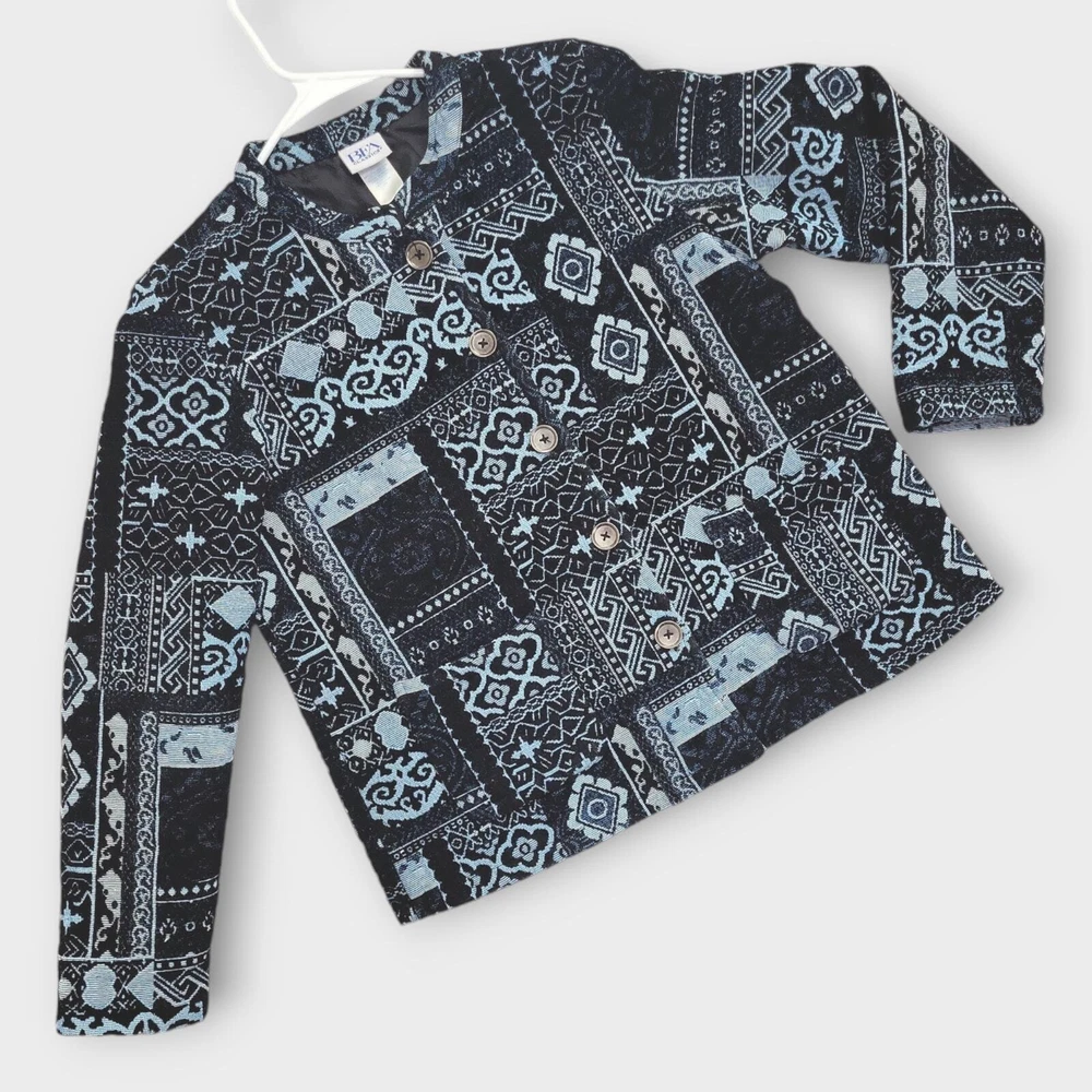 BFA Classics Blue Print Button Front Jacket SIZE: Tagged Size 14 *** ~ Approx measurements in pics CONDITION: Preloved and in Good Condition. No holes, tears, stains FABRIC: Polyester / Cotton Blend CARE: Machine Wash DETAILS: ~ Shades of Blue - Mixed Print Patchwork look design ~ Long Sleeve ~ Button Front Closure ~ Mandarin collar ~ 2 Front Pockets ~ Straight Hem ~ Boxy type cut ~ Lined *** Make sure it fits - Sizing varies between brands and decades. It's best to know your body measurements and compare them to clothing measurements and your preferred fit. If you need help on how to do this, or additional measurements, let me know. I will be happy to help.