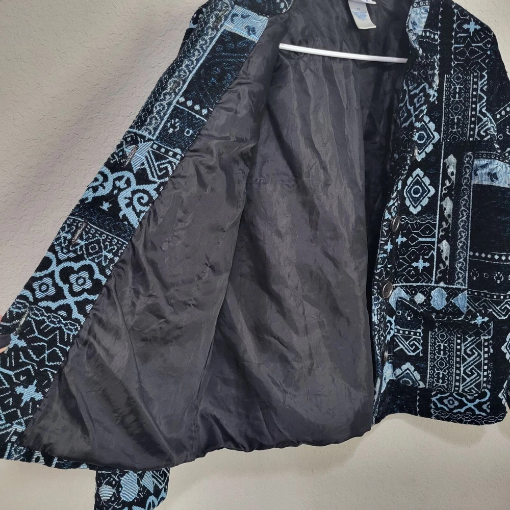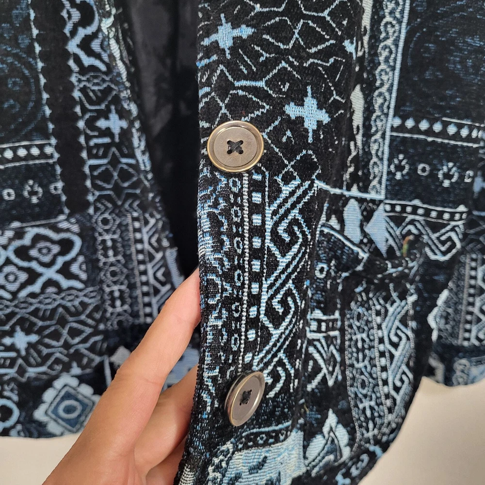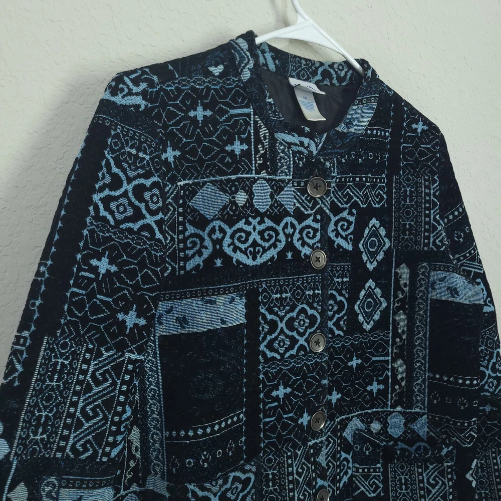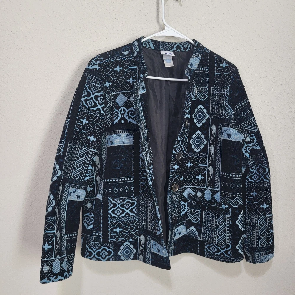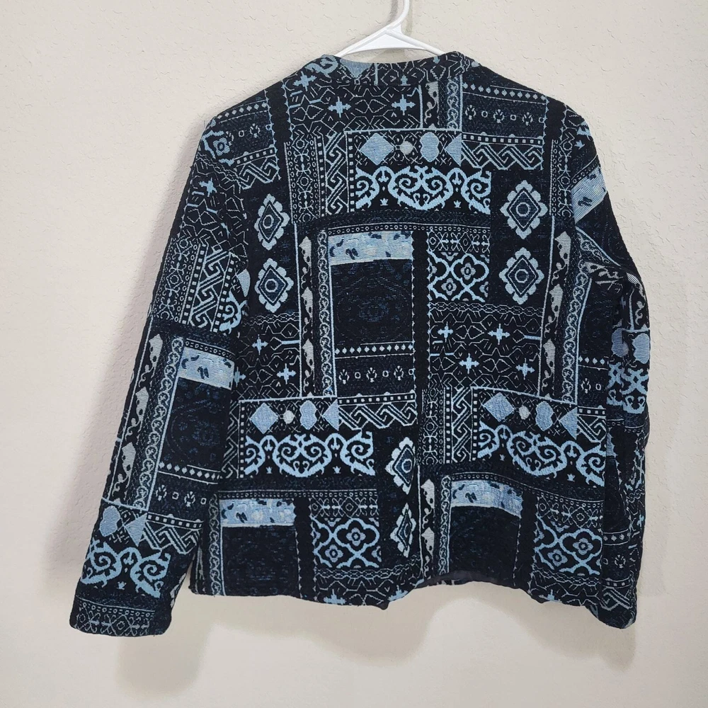 BFA Classics Blue Print Button Front Jacket SIZE: Tagged Size 14 *** ~ Approx measurements in pics CONDITION: Preloved and in Good Condition. No holes, tears, stains FABRIC: Polyester / Cotton Blend CARE: Machine Wash DETAILS: ~ Shades of Blue - Mixed Print Patchwork look design ~ Long Sleeve ~ Button Front Closure ~ Mandarin collar ~ 2 Front Pockets ~ Straight Hem ~ Boxy type cut ~ Lined *** Make sure it fits - Sizing varies between brands and decades. It's best to know your body measurements and compare them to clothing measurements and your preferred fit. If you need help on how to do this, or additional measurements, let me know. I will be happy to help.