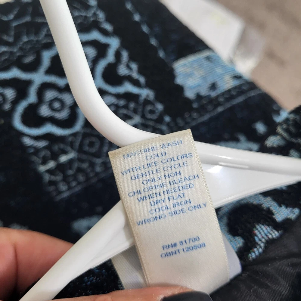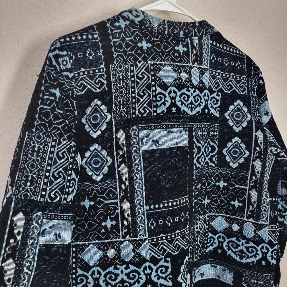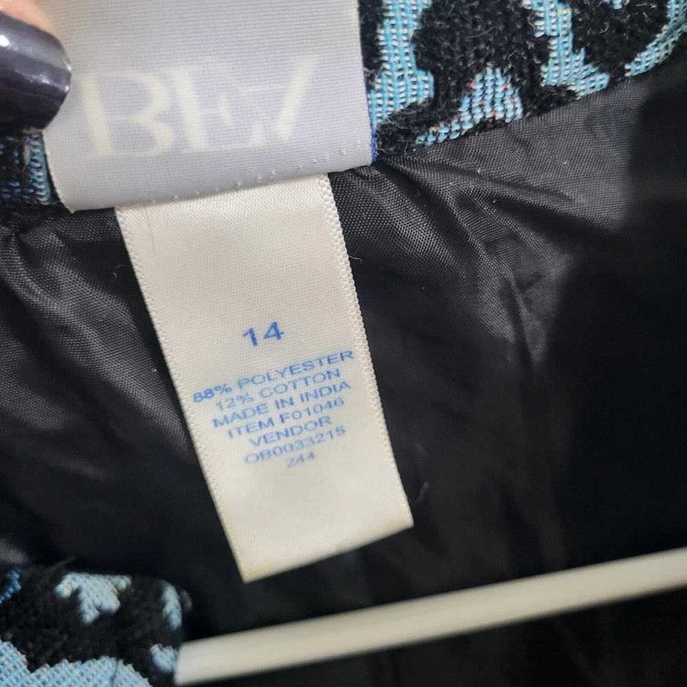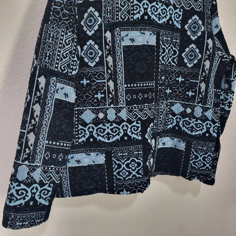 BFA Classics Blue Print Button Front Jacket SIZE: Tagged Size 14 *** ~ Approx measurements in pics CONDITION: Preloved and in Good Condition. No holes, tears, stains FABRIC: Polyester / Cotton Blend CARE: Machine Wash DETAILS: ~ Shades of Blue - Mixed Print Patchwork look design ~ Long Sleeve ~ Button Front Closure ~ Mandarin collar ~ 2 Front Pockets ~ Straight Hem ~ Boxy type cut ~ Lined *** Make sure it fits - Sizing varies between brands and decades. It's best to know your body measurements and compare them to clothing measurements and your preferred fit. If you need help on how to do this, or additional measurements, let me know. I will be happy to help.