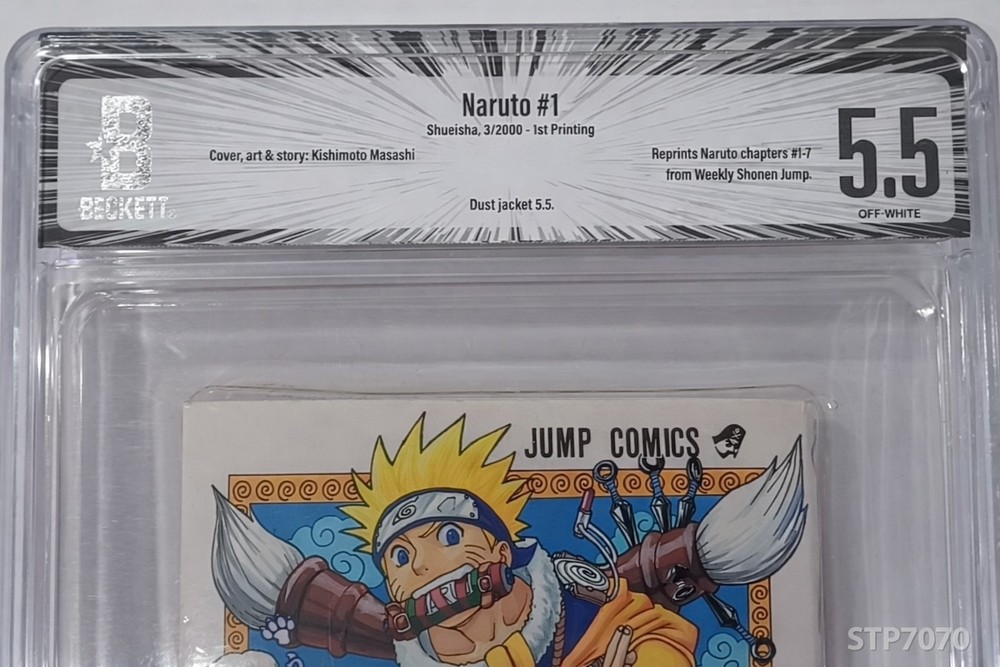 Naruto Vol.1 – Japanese First Printing (2000) – Jump Comics Written and illustrated by Masashi Kishimoto. This manga is professionally graded and sealed by Beckett with a grade of 5.5 (Off-White pages) . Details: • Series: Naruto • Volume: 1 • Publisher: Shueisha / Jump Comics • Year: 2000 • Language: Japanese • First Printing • Grading company: Beckett • Grade: 5.5 A great collectible for Naruto fans and manga collectors. Shipping: Ships worldwide. The item will be carefully packaged with bubble wrap and protection to ensure safe delivery. The item shown in the photos is the exact item you will receive.