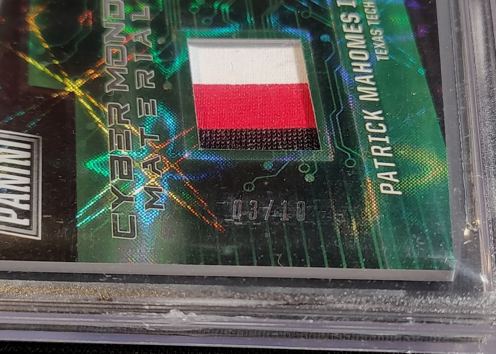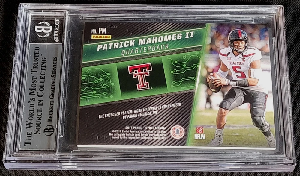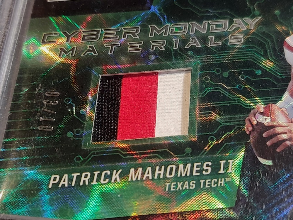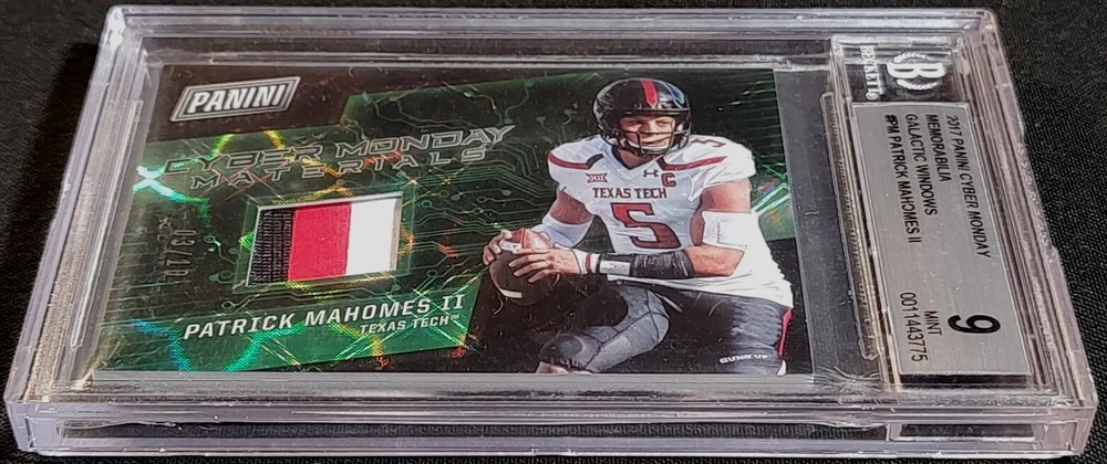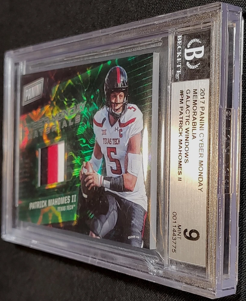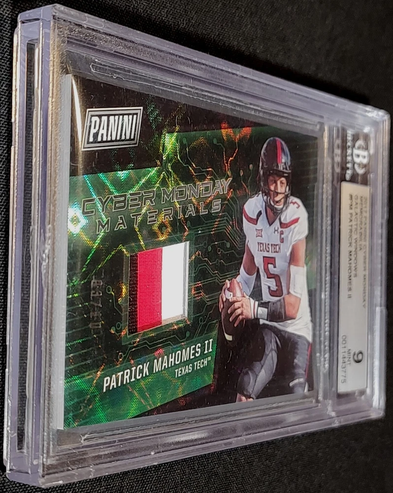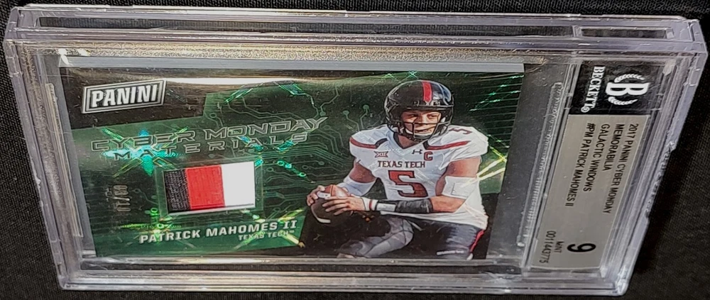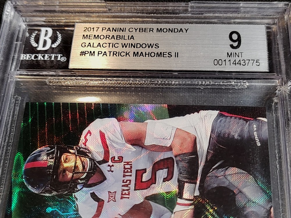 WOW WOW WOW!!!! STUNNING PATRICK MAHOMES II RC PATCH #'d /10 GRADED BGS 9 MINT!!! BGS POP 2 NONE HIGHER!!! SICK THREE COLOR SWATCH OFF HIS TEXAS TECH JERSEY, PERFECTLY CENTERED LIKE THE CARD ITSELF, VERY POPULAR GALACTIC WINDOWS VARIATION, LOOKS INCREDIBLE PLEASE SEE PICS!!! SO SO RARE PANINI ONLY MADE TEN OF THESE GOOD LUCK FINDING ANOTHER ONE, AND IF YOU WANT THE BEST ONE ON EARTH YOURE LOOKIN AT IT!!! NFL MVP HIS FIRST YEAR STARTING!!! SUPER BOWL MVP THE NEXT YEAR!!!! BEEN TO AT LEAST THE AFC CHAMPIONSHIP GAME EVERY YEAR HE HAS STARTED NOW HE'S A 3X SUPER BOWL MVP, A 3X NFL MVP AND HE'S THE FIRST PLAYER TO EVER WIN BOTH AWARDS IN THE SAME SEASON!!! HE WILL BE THE GOAT AND OWN ALL THE QUARTERBACK RECORDS BY THE TIME HE RETIRES, INVEST NOW!! 2017 Panini Cyber Monday PATRICK MAHOMES II Cyber Monday Materials (SSP GALACTIC WINDOWS VARIATION /10) football card #PM, serial numbered, stamped 3/10 - EXTREMELY RARE SHORT PRINT RUN ONLY 10 EXIST!! Priority shipping anywhere in the United States is $11.99. International shipping is available. Combined shipping is available upon request. SERIOUS INQUIRIES ONLY PLEASE!! PLEASE VISIT OUR STORE!!!! WE HAVE SO MANY RARE AND HARD TO FIND ITEMS!!! PLEASE HAVE A NICE DAY AND THANKS FOR LOOKING!!! We put a lot of work and time into these listings, provide plenty of pictures and as much info as possible about the items. We rarely do auctions and mostly use the buy it now or best offer format. So there is no rush to buy anything, we ask that you take your time reviewing the item and ask any questions, request more detailed pictures, whatever it is just make sure you want this before purchasing as our items are sold AS IS. Please ask any questions if the listing hasn't already provided enough detail for you. We want you to be happy and have a pleasant transaction but we do not accept returns so please make sure you want it before purchasing .