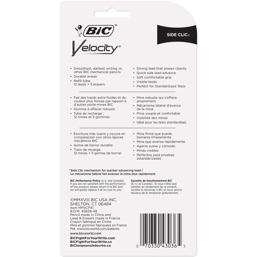 BIC Velocity side click Mechanical pencils offer a more convenient way to advance your lead. Just click the side-click lead advance button embedded in the grip, and you're ready to go. These mechanical pencils offer the smoothest, darkest writing compared to other BIC Mechanical pencils. These pencils feature a vibrantly-colored soft grip that provides extra comfort and control and a durable eraser. Each pencil comes with three strong #2 leads that do not smudge and erase cleanly, making it ideal for standardized tests. Soft comfortable grip helps enhance precision and control while writing. Durable eraser cleanly removes marks from the page. Strong lead allows for smooth, dark writing and does not smudge. Perfect for Standardized Tests. Available in 0.5 mm and 0.7 mm.