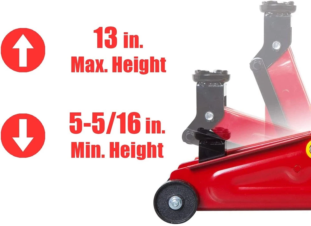 Big Red 1.5 Ton Trolley Service/Floor Jack with Blow Mold Carrying Storage Case Key Features: Hydraulic trolley floor jack is constructed with heavy duty steel, providing long term durability with an industrial luster Features a 1.5 ton (3,000 lbs) capacity with a minimum lifting height of 5-3/5" and a maximum height of 13"; Ideal for most cars, trucks, and SUVs Safety bypass system prevents over-loading and ensures safe operation Equipped with (2) large steel casters and (2) 360-degree swivel casters for smooth maneuverability Includes a plastic blow mold carrying case for easy storage when not in use; Includes a 1 year limited manufacturer warranty Equipped with (2) large steel casters and (2) 360-degree swivel casters for smooth maneuverability; Extra long saddle neck saves time when lifting higher vehicles.Handle Length:24.5 inch Specifications: Brand:Big Red Lifting Capacity: 1.5 Ton (3,000 lbs) Color: Red Material: Alloy Steel Minimum Height: 5-5/16" Maximum Height: 13" Package Dimensions: 18.3 x 7.7 x 5.3 inches (L x W x H) Item Weight : 18 pounds Package Includes: 1 x One Pair Jack Stands 1 x Case Product Description: Torin BIG RED T820014S hydraulic trolley floor jack is constructed with heavy duty steel, providing long term durability with an industrial luster. This floor jack has a 1.5 ton (3,000 lbs) capacity and features a minimum lifting height of 5-3/5" and a maximum height of 13", which is ideal for most cars, trucks, and SUVs. A safety bypass system prevents over-loading and ensures safe operation. Equipped with (2) large steel casters and (2) 360-degree swivel casters for smooth maneuverability. The Torin BIG RED T820014S hydraulic trolley floor jack is equipped with a handle for quick portability. It includes a plastic blow mold carrying case for easy storage when not in use. IMPORTANT: Before first use on any lift, verify that a daily inspection has been completed and that all components are in the proper working order.