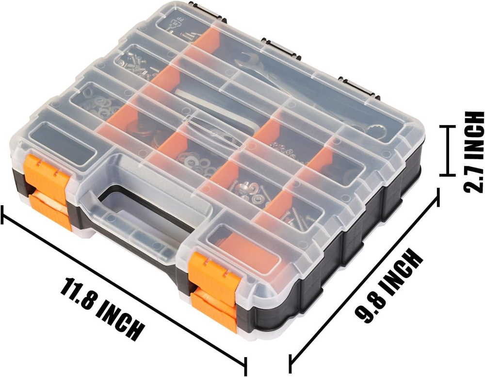 Store New Arrivals Add to Favorite View Feedback Contact BIG RED AG322R Torin Double Sided Tool and Hardware Storage Box: Portable Small Parts Organizer with Removable Plastic Dividers for Tools, Small Items and Jewelry, Black/Orange Description Item model number AG322R Style Small Parts Organizer Country of Origin China Usage Hardware Tools Batteries Required? No Number of Compartments 1 Brand BIG RED Material Plastic Maximum Weight Recommendation 13.22 Pounds Manufacturer Torin Item Package Quantity 1 Water Resistance Level Water Resistant Item Weight 2.32 pounds Finish Powder Coated Special Features Portable Part Number AG322R Mounting Type Tabletop Mount Color Multiple Shape Rectangular Included Components Plastic Tool box Product Dimensions 12.99"L x 11.02"W x 3.94"H Size 13" STURDY & DURABLE: Made of heavy-duty plastic material, this tool box has a double-sided design with 4 latches for good stability to keep items properly placed and unbreakable when dropped. REMOVABLE PARTITION DESIGN: 34-compartment double-sided organizer tool box with 30 removable dividers and 4 fixed dividers. The removable dividers are easy to slide on and off to customize the storage space you want. PORTABLE: This tool box organizer is very lightweight and it has a convenient carrying handle for easy PORTABILITY: It can be easily placed in the garage, closet, shed, car and other places, ideal for work and on the go. LARGE CAPACITY: This tool box organizer features double-sided design, ensuring ample storage space, suitable for storing various parts, keeping all your DIY accessories and tools convenient and tidy, measuring 11. 8" * 9. 8" * 2. 7". WIDE VERSATILITY: This tool box organizer is suitable for storing a variety of parts such as screws, nuts, bolts, fasteners, electrical connectors, beads, hair accessories, fishing gear and other items. This tool box organizer is made of heavy-duty plastic material,which has a double-sided design with 4 latches for good stability to keep items properly placed and unbreakable when dropped. 34-compartment double-sided organizer tool box with 30 removable dividers and 4 fixed dividers. The removable dividers are easy to slide on and off to customize the storage space you want. This tool box organizer is very lightweight and it has a convenient carrying handle for easy PORTABILITY: It can be easily placed in the garage, closet, shed, car and other places, ideal for work and on the go. This tool box organizer features double-sided design, ensuring ample storage space, suitable for storing various parts, keeping all your DIY accessories and tools convenient and tidy, measuring 11. 8" * 9. 8" * 2. 7". This tool box organizer is suitable for storing a variety of parts such as screws, nuts, bolts, fasteners, electrical connectors, beads, hair accessories, fishing gear and other items. If you meet any problems, please feel free to contact our customer service team and we will do our best to help you fix your issues. ABOUT US We offer the best prices around on high quality products. Our E-store includes media such as books, movies, music and games while offering electronics, toys, sporting apparel, clothing, tools, general home, garden items and more. SHIPPING We are always working hard to ensure your package arrives as soon as possible. Please understand that some factors like weather, high postal traffic, and the performance of shipping companies are outside of our control. We offer free shipping to the lower 48 states and ship within 2 business days of payment, usually sooner. We do not accept P.O. Boxes. Please provide a physical address. RETURNS We offer a 30-Day Return Policy on items which you are not completely satisfied with. You have the option for a full-refund or an exchange of the item. No returns are available on items shipped outside of the USA. PAYMENT We accept PayPal. CONTACT US This page content is yet to come Please ad us to your favorite seller and visit again later Thank You CUSTOMER SATISFACTION We try our very best to make sure every customer is completely satisfied. If there's a problem, message us! We're happy to help.