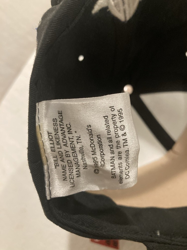 You are bidding on a VINTAGE & RARE ORIGINAL RELEASED 1995 BILL ELLIOTT #94 McDONALD’S/BATMAN FOREVER “THUNDERBAT” HAT NEW with TAGS. The HAT is in NEW condition( See Pictures ). This HAT is 65% POLYESTER/35% COTTON and ONE SIZE FITS ALL and has an EMBROIDERED BILL ELLIOTT AUTOGRAPH on the HATS BILL. SHIPPING will be $9.99 and will be shipped out the day after the payment is received. Any QUESTIONS or OFFERS: SEVEN ONE SEVEN EIGHT EIGHT ONE EIGHTEEN SIXTY SEVEN.