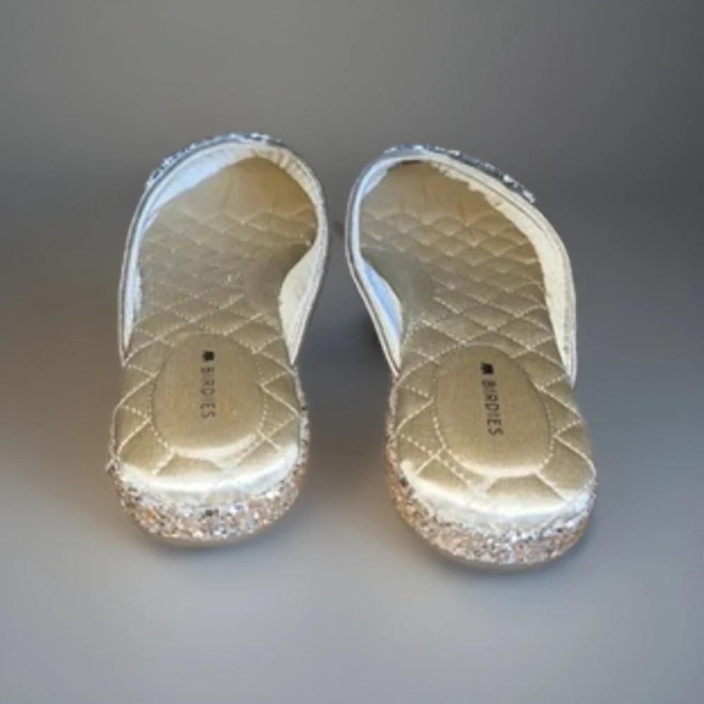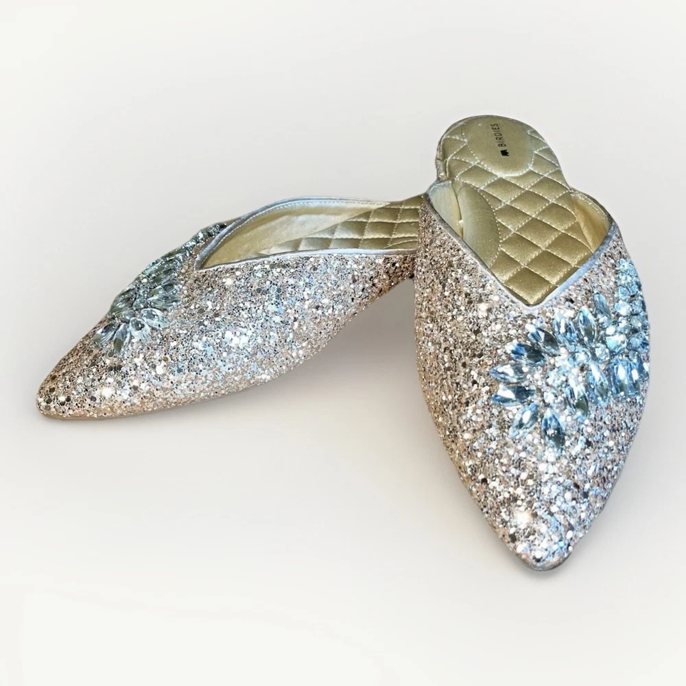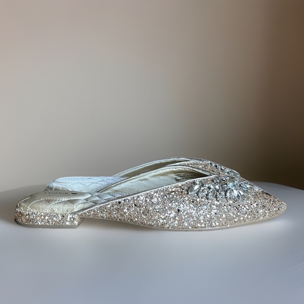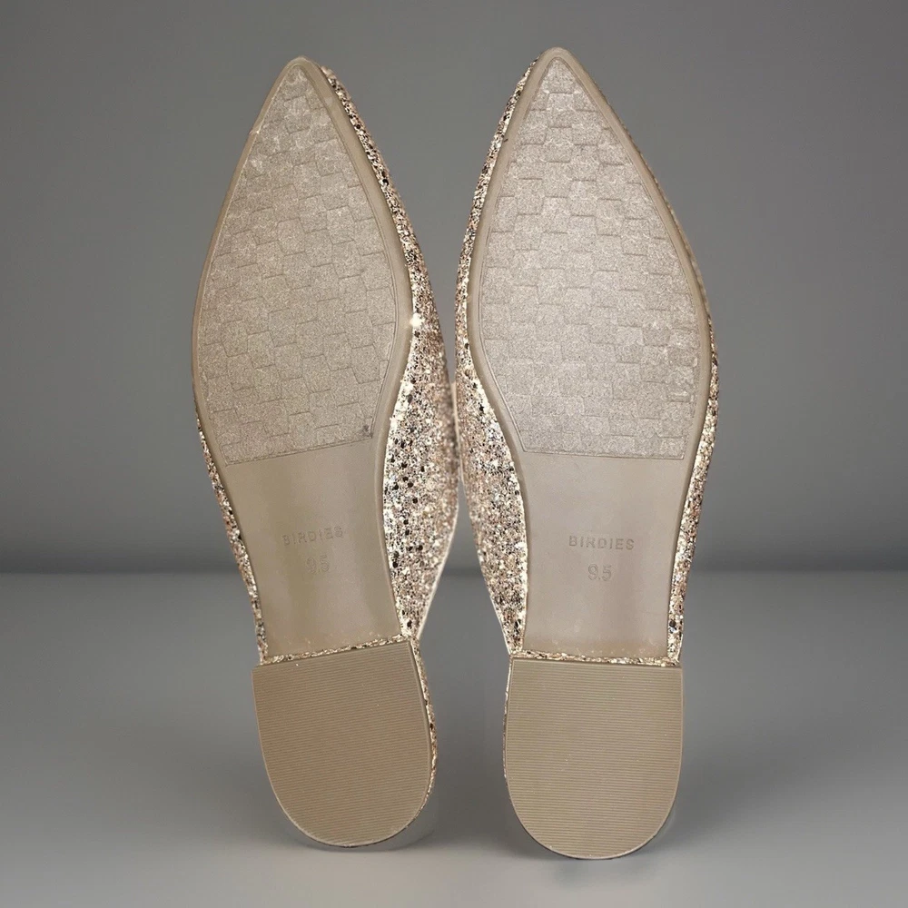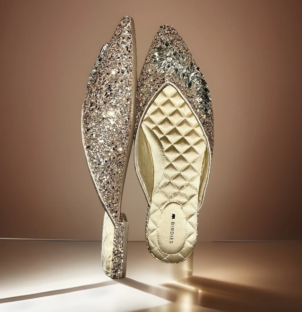The BIRDIES THE SWAN Jeweled MULES Pointed Flats in Champagne Gold Bling are a stylish and elegant choice for special occasions. These slip-on flats feature a pointed toe design with jeweled accents, adding a touch of glamour to your outfit. With a comfortable cushioned outsole and leather lining, these mules are perfect for formal events, weddings, parties, and more. The champagne gold color and glittered pattern make these flats a standout piece, adding a festive touch to your ensemble. Perfect for the fashion-forward woman looking to make a statement at any event.
