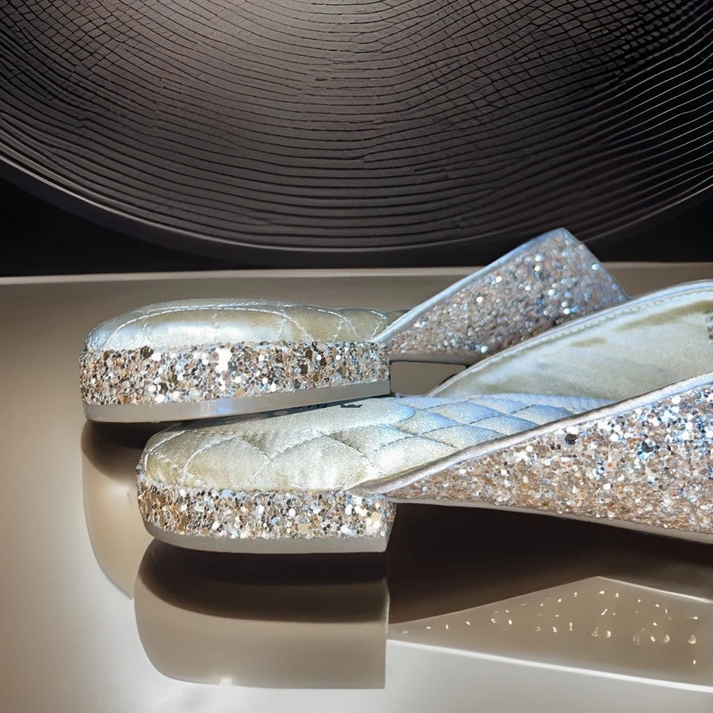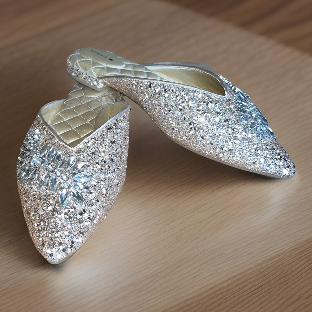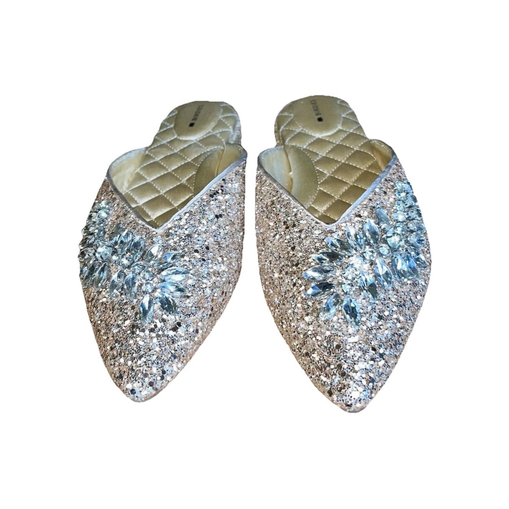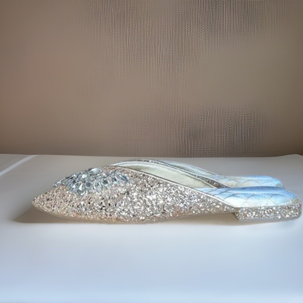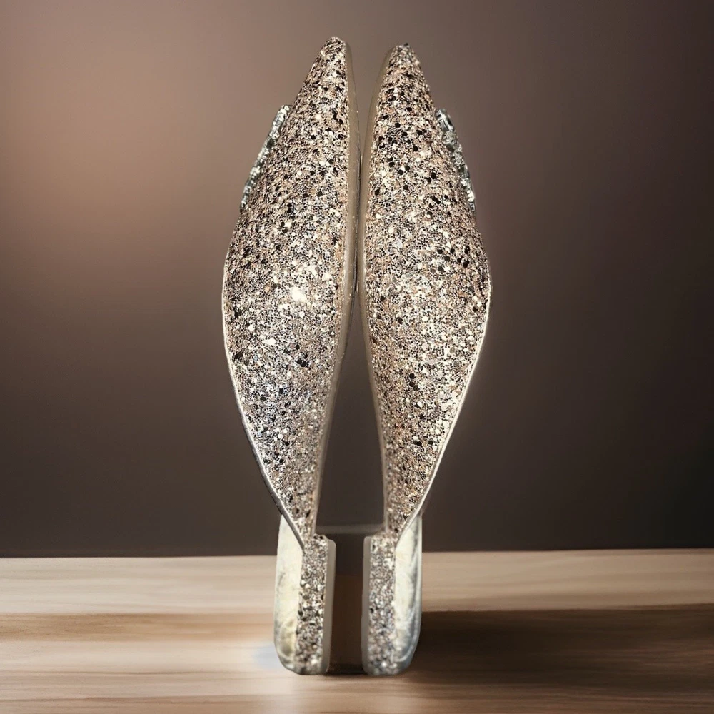 The BIRDIES THE SWAN Jeweled MULES Pointed Flats in Champagne Gold Bling are a stylish and elegant choice for special occasions. These slip-on flats feature a pointed toe design with jeweled accents, adding a touch of glamour to your outfit. With a comfortable cushioned outsole and leather lining, these mules are perfect for formal events, weddings, parties, and more. The champagne gold color and glittered pattern make these flats a standout piece, adding a festive touch to your ensemble. Perfect for the fashion-forward woman looking to make a statement at any event.