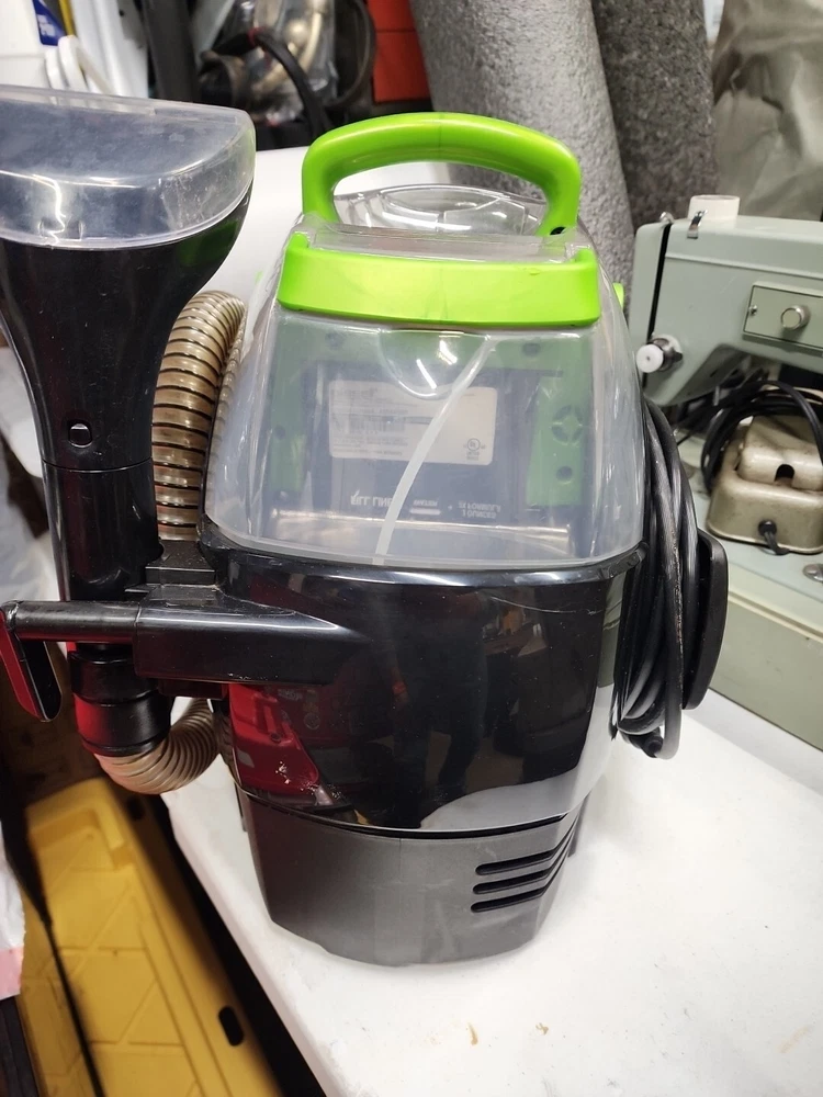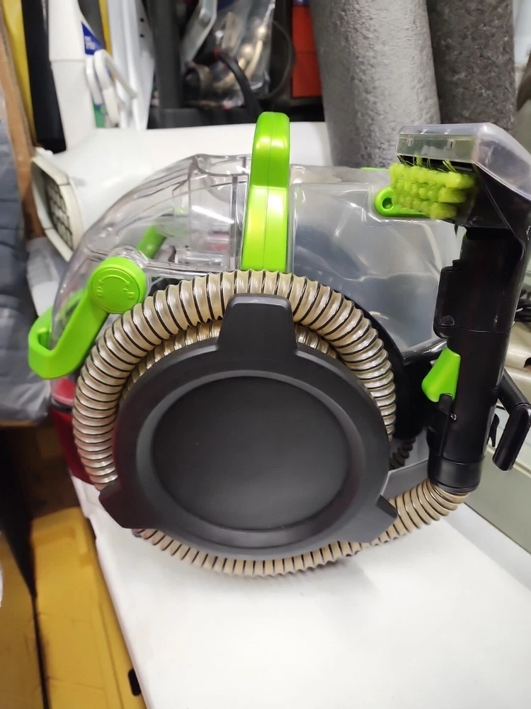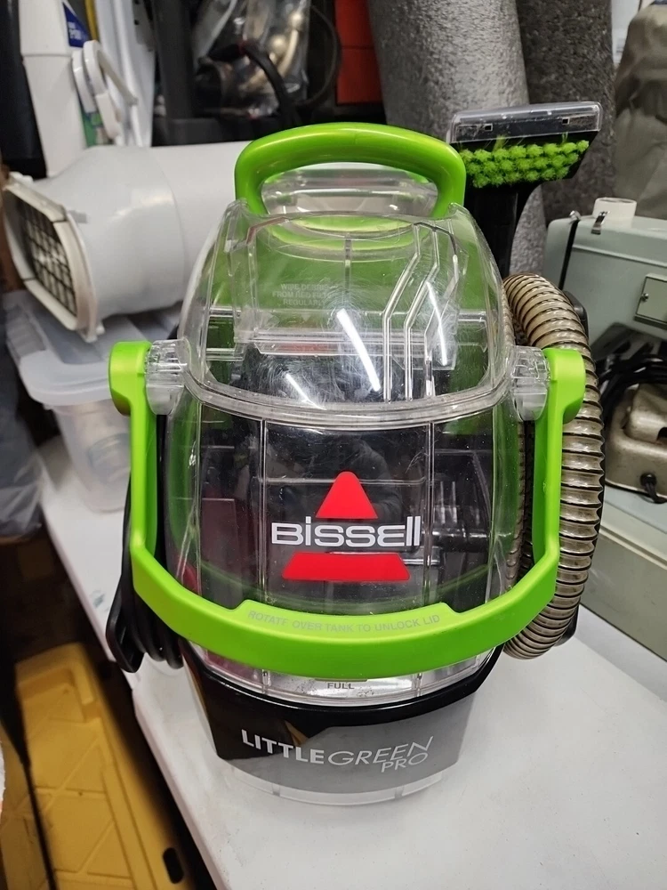 This BISSELL Little Green Pet Pro Portable Carpet Cleaner is a blue canister vacuum with cyclone filters and a 2.8 L capacity. It is designed for portable use, making it easy to clean upholstery. The model number is 2891 and it includes an upholstery brush. This bagless vacuum cleaner is corded and ideal for cleaning up pet messes and other stains. Perfect working condition with all accessories and parts.