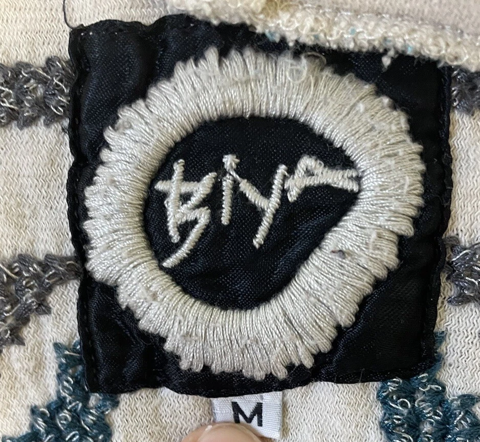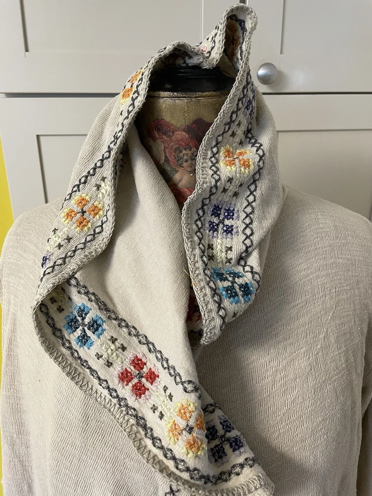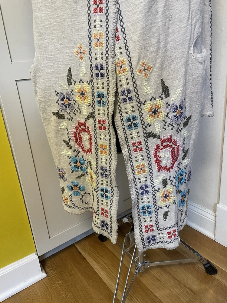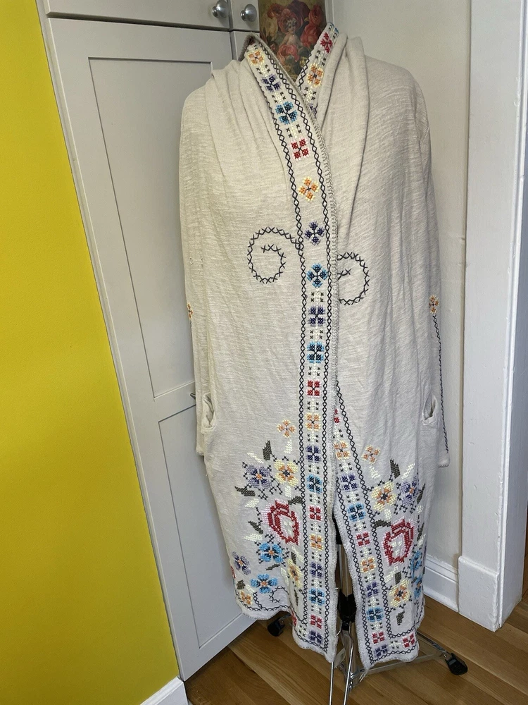 BIYA JOHNNY WAS Embroidered Cross Stitch Hooded Duster Cardigan Boho Sz M Cream