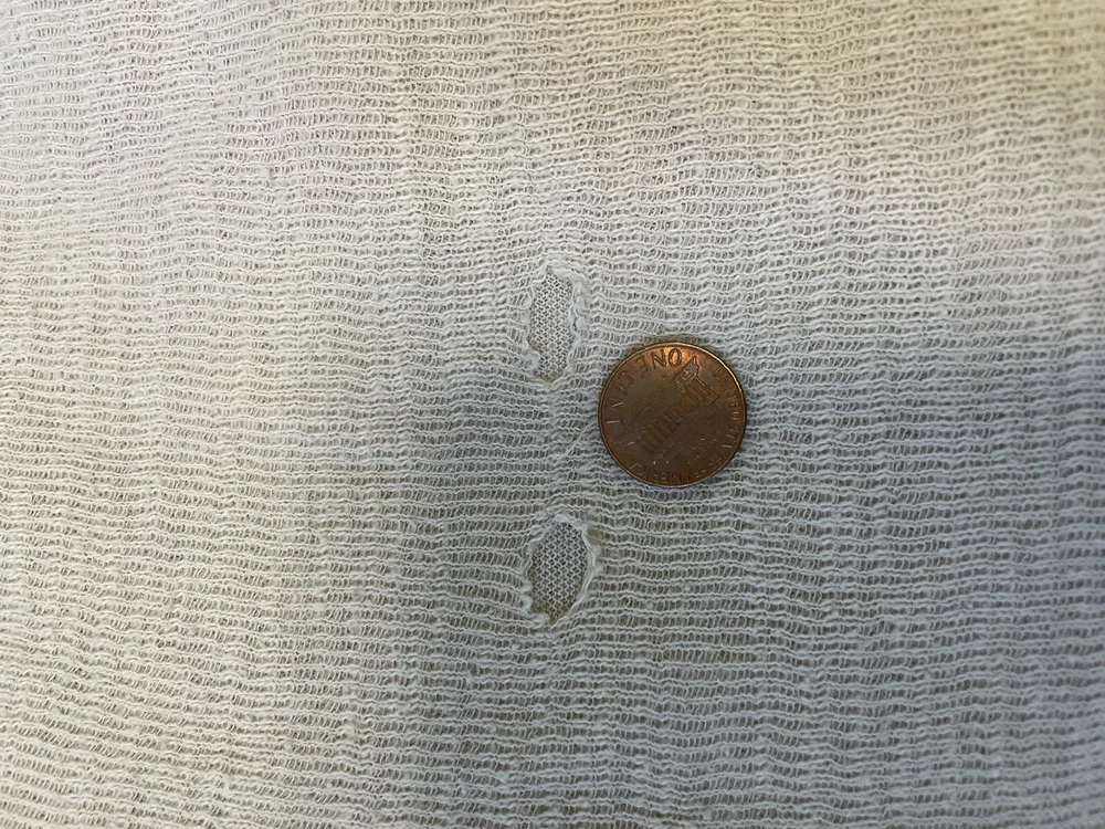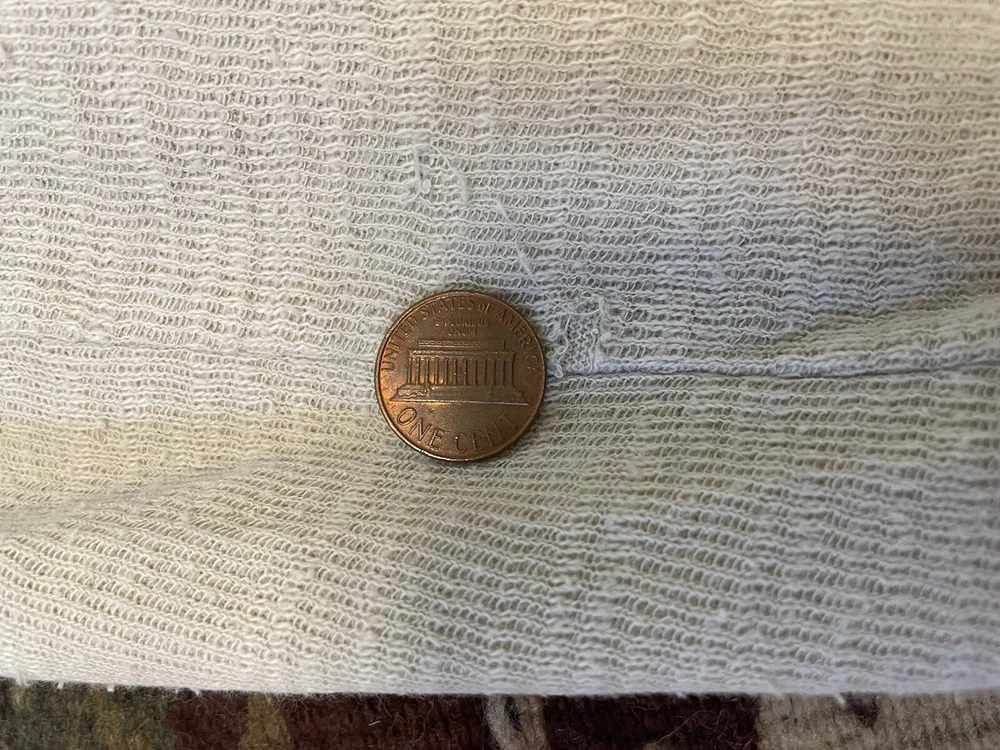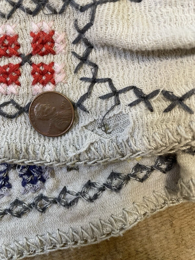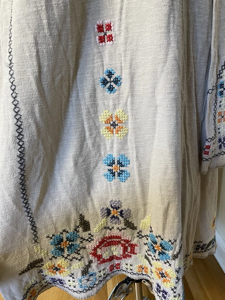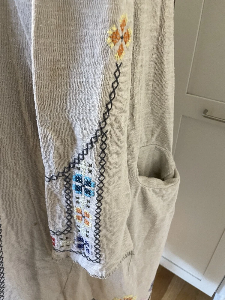 Gorgeous embroidered cotton duster/coating from Johnny Was/Biya. Beautiful stitching detail on back, hood, hems and sleeves. There are several holes in the top layer of fabric; the fabric is fine and has a heavier lining to support it. No closure. In overall good condition! Women’s size M