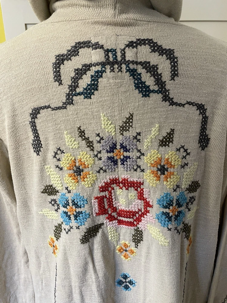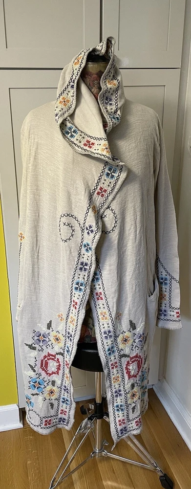 Department: Women Fabric Type: Knit Theme: Art, Beach, Bohemian, Classic, Designer, Hippie, Peasant Brand: Johnny Was Country/Region of Manufacture: China Size: M Sleeve Length: Long Sleeve Type: Coatigan Size Type: Regular Accents: Embroidered Pattern: Floral Fit: Regular Features: All Seasons, Hooded, Limited Edition, Oversized, Pockets Outer Shell Material: Cotton Jacket/Coat Length: Long Style: Duster Color: Multicolor