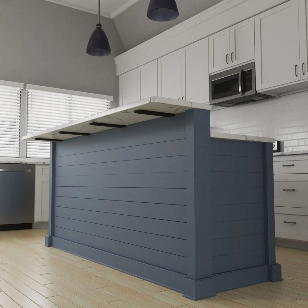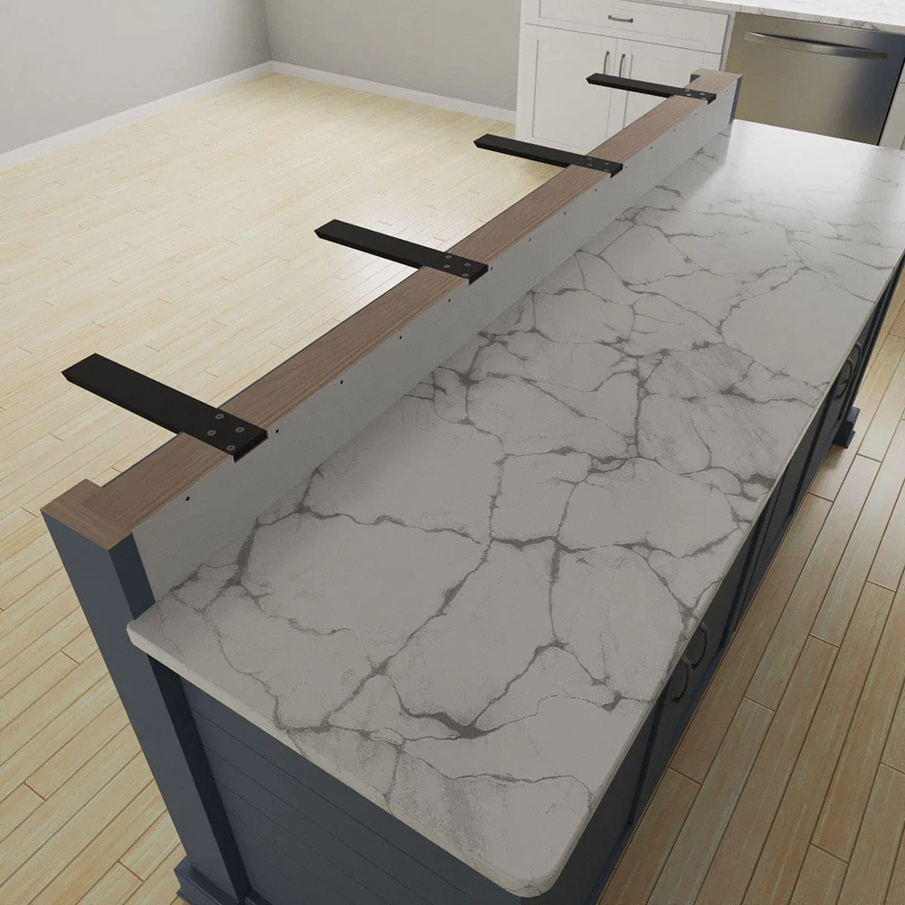 floating brackets are ideal for pony or knee wall applications, allowing for a strong overhang support. Non-intrusive brackets offer a sleek, modern finish to any project without comprising on the support of 1/2" thick authentic, sturdy steel. Manufactured with beveled edges, the black coated brackets eliminate an application with sharp edges. Manufactured from high-quality, 1/2" thick solid steel Near invisible installation, with sturdy support, offers a non-intrusive bracket option Pre-drilled mounting holes for hassle-free install Non-invasive brackets are ideal for a "floating countertop" effect Beveled ends mean no more sharp bracket edges | , authentic steel support brackets allow for a modern kitchen look