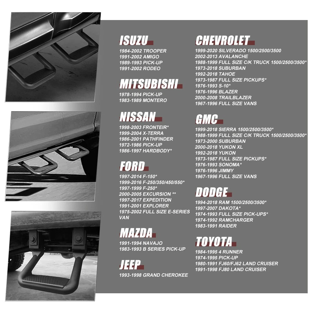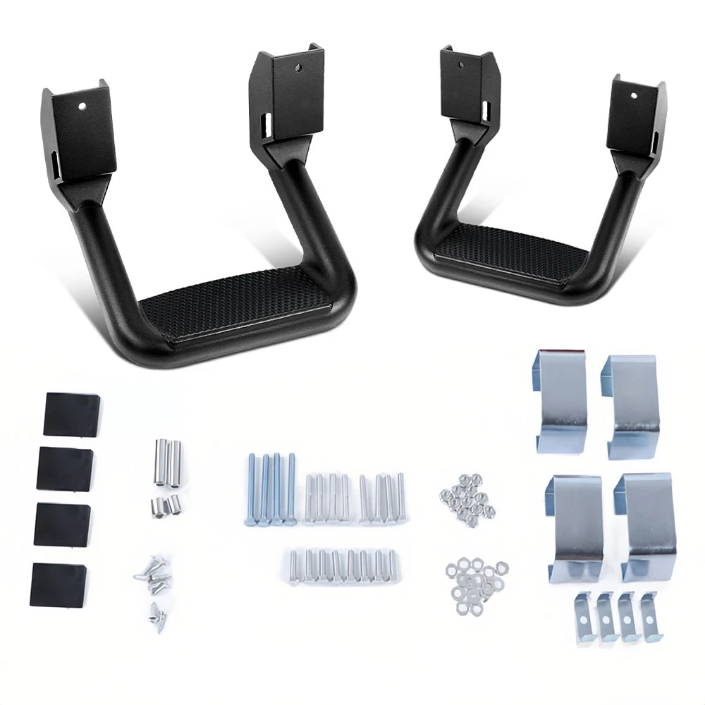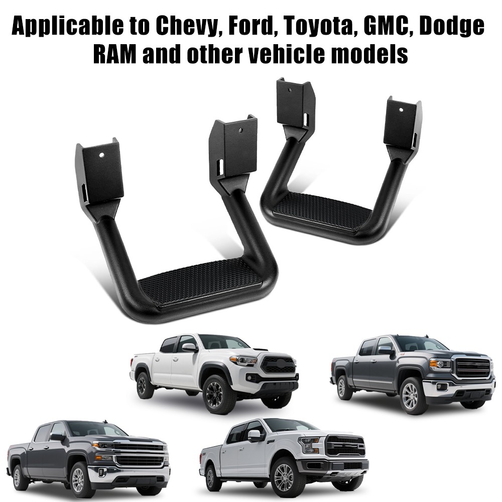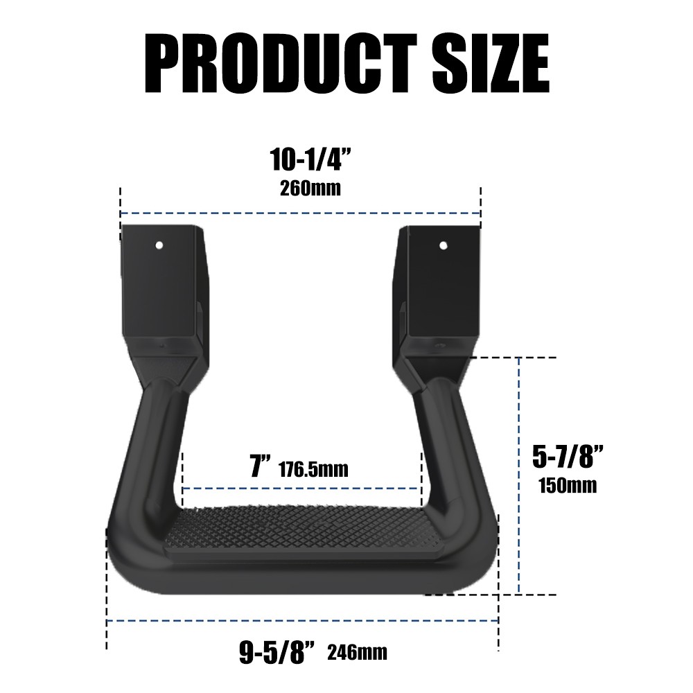 PAIR BLACK ALUMINUM FOR UNIVERSAL PICKUP TRUCK/SUV SIDE HOOP STEPS 11 in. L x 6 in. H x 12 in. W Include:The same as picture 1 x Pair of Side Steps Hoop(2pcs side steps), both the driver's and passenger's side Includes all Hardware Details: 1 Inch Diameter Stirrup Side Steps Mount to Trucks or SUVs Design with Non-Slip Step Pad, Strong, Lightweight and Paintable Die-Cast Aluminum Brackets, Solid Mount Heavy-duty aluminum construction with anti-corrosion powder coating Universal Fit / OEM Fit Matte Black / Anti-Rust Drilling Required: Vehicle must have a structurally sound rocker panel to mount step,the minimum to mount to a flat rocker panel will be 3.25". If using the lower mounting hole on the rocker pinch weld, you will still need the 3.25" above the pinch weld. Please check if it matches your vehicle type.